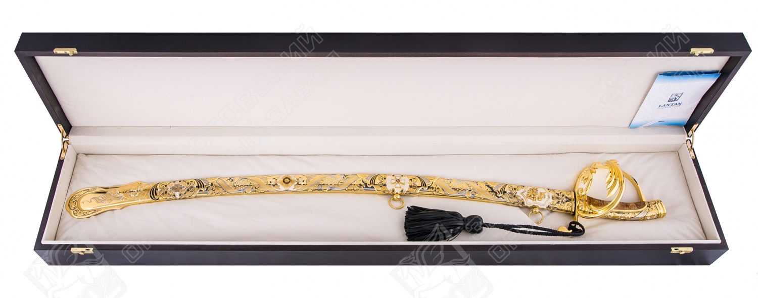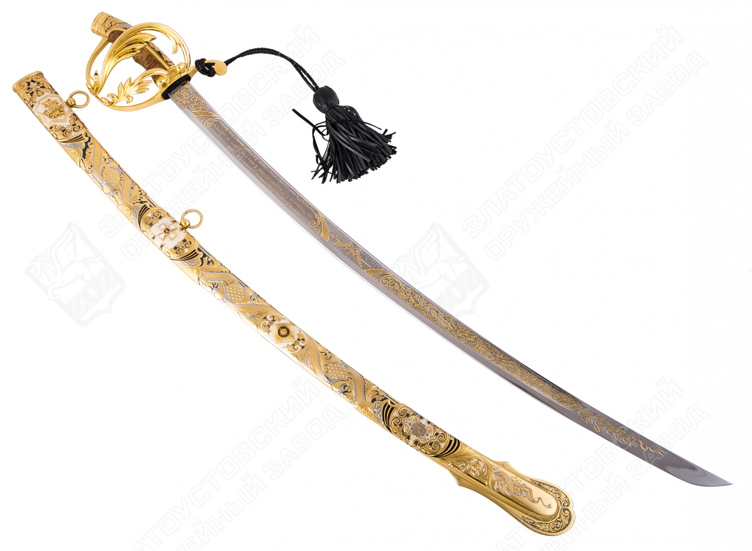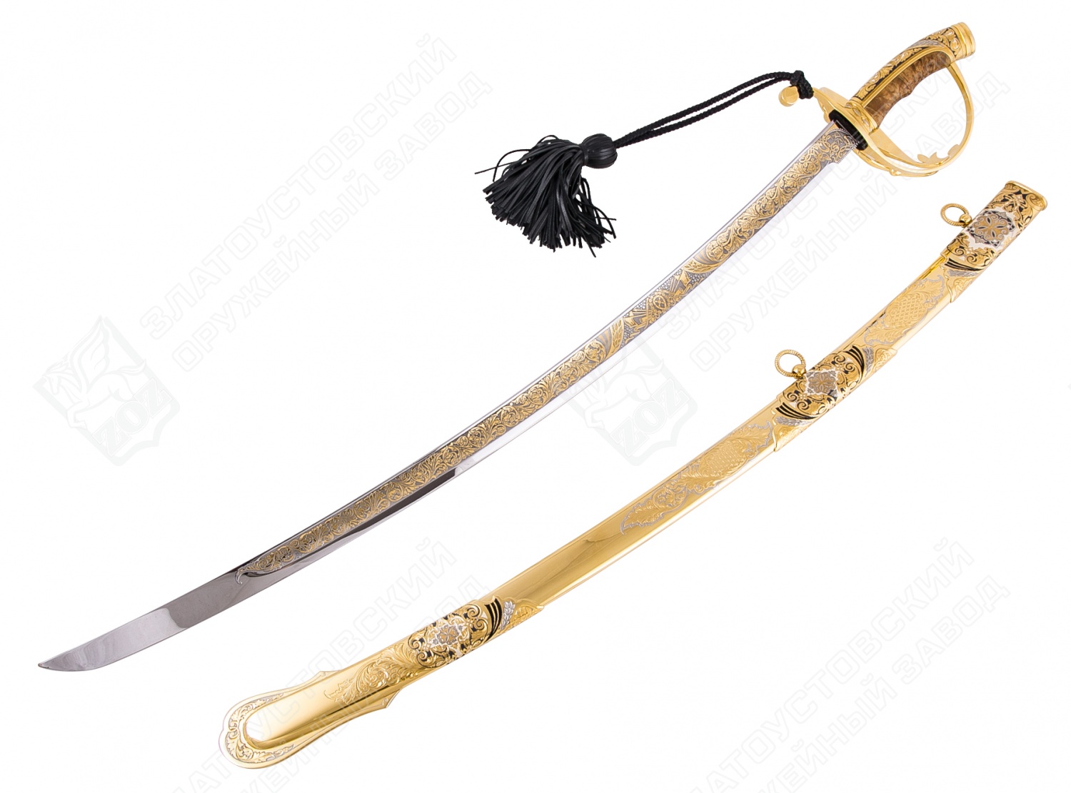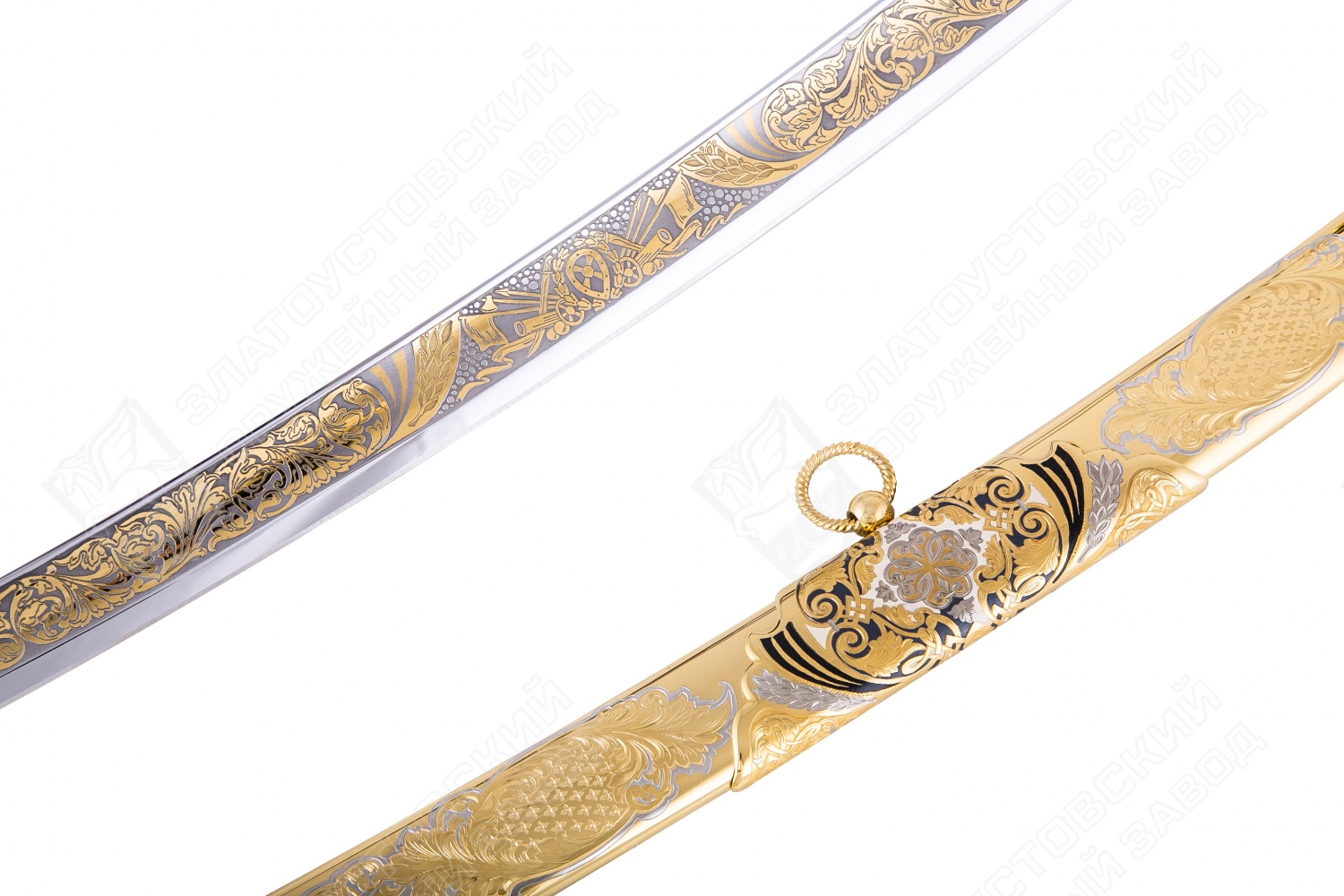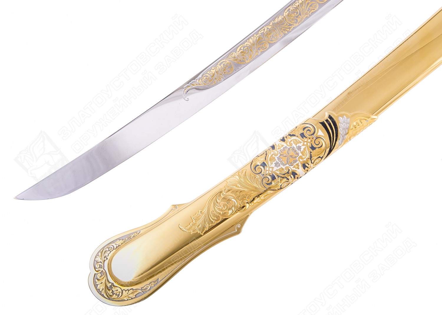 Сабля георгий победоносец (сталь нержавеющая эи-107) златоуст. Материал: клинок из стали ЭИ-107; рукоять со вставками из ценных пород дерева; рукоять и ножны из латуни. Покрытие: золотом 999,9; серебром 925; никелем. Техника исполнения: токарные и слесарные работы, рисовка кистью на металле, многоступенчатая гравировка иглой по лаку, травление, ручная подрезка, полировка. Эта сабля – подарок для настоящего мужчины. Изделие выполнено из нержавеющей стали, на ножне из латуни объемное изображение Георгия Победоносца, Анненского ордена за службу и храбрость. Патриотичную и мощную по своей энергетике композицию дополняют гравюры георгиевских лент. На самом клинке вырисована молитва Святому Георгию Победоносцу, которая защитит и придаст сил в любом деле, убережет владельца сабли от бед. Размеры: общая длина 1076 мм. длина клинка 900 мм. ширина клинка 32 мм. ? ×сталь Тип стали Кованая нержавеющая 40Х10С2М(ЭИ-107) Покрытие Гальванический метод