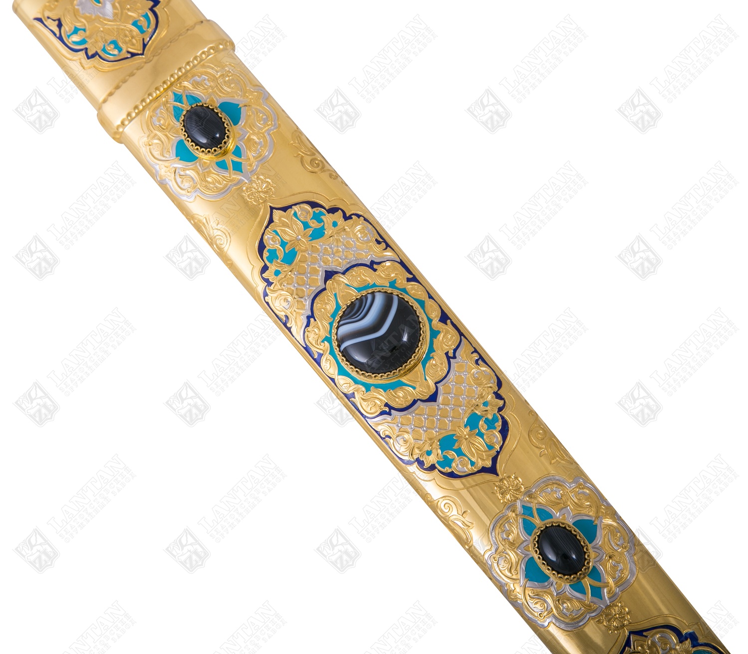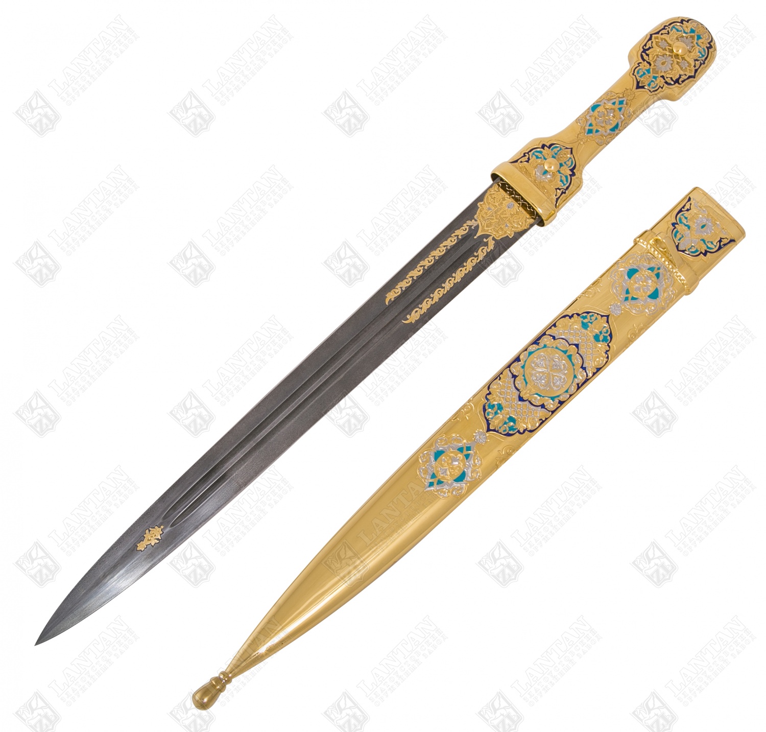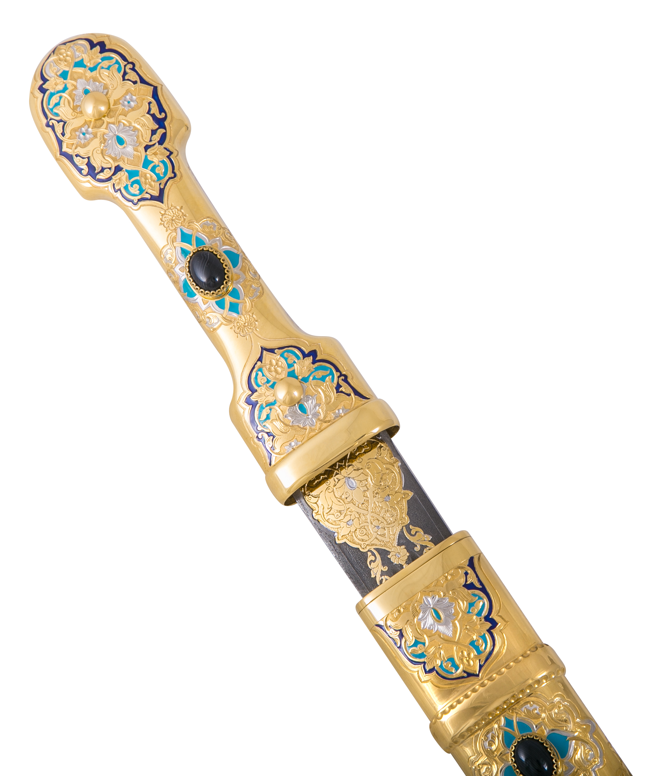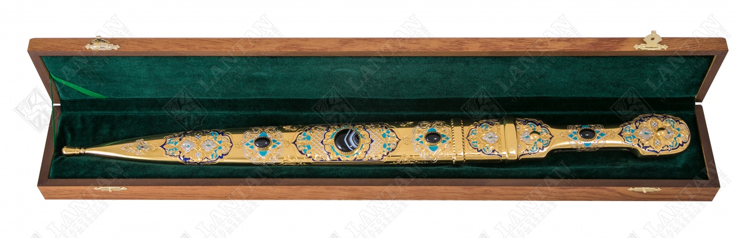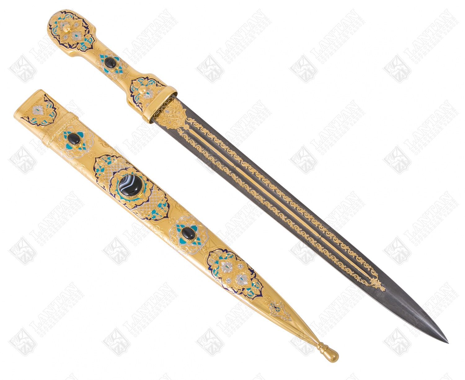 Кинжал восточный "арабеска" из булатной стали златоуст. Материал: клинок из булатной стали; рукоять и ножны из латуни; эмаль; инкрустация ювелирными камнями (агат). Покрытие: золотом 999,9; никелем. Техника исполнения: токарные и слесарные работы, рисовка кистью на металле, многоступенчатая гравировка иглой по лаку, травление, ручная подрезка, полировка, чернение латуни. Кинжал «Арабеска» можно смело отнести к произведению искусства, выкованному Златоустовскими мастерами. Клинок из кованой булатной стали изготовлен вручную и украшен золотистым орнаментом, прекрасно оттеняющем холодный блеск металла. Ножны и рукоять выдержаны в светлых тонах и украшены агатом. Размеры: общая длина - 610 мм. длина клинка - 400 мм. ширина клинка - 40 мм. ? ×сталь Тип стали Кованая булатная Покрытие Гальванический метод