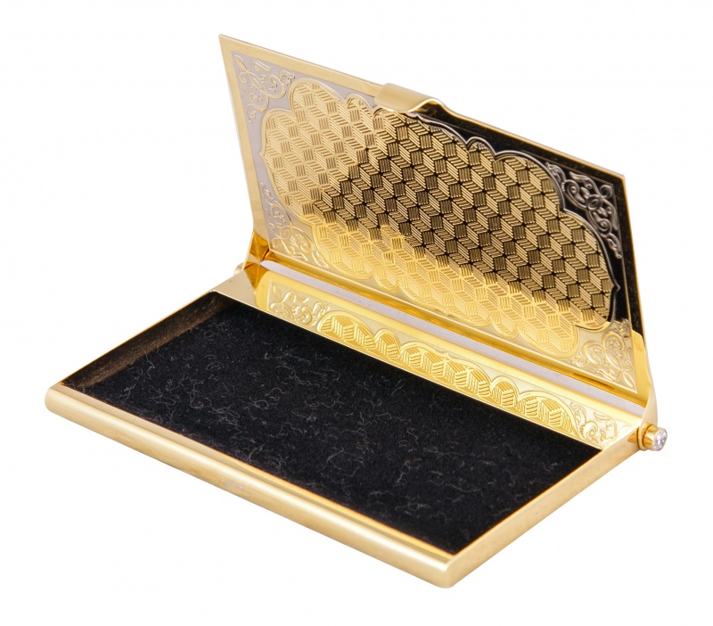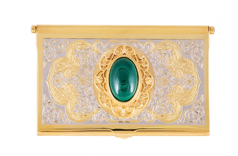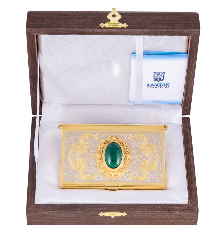 Визитница карманная "малахит" (элитная) златоуст. Материал: латунь, малахит. Покрытие: золотом 999,9; никелем. Техника исполнения: токарные и слесарные работы, рисовка кистью на металле, многоступенчатая гравировка иглой по лаку, травление, ручная подрезка, полировка. Эффектная визитница из латуни и малахита. Композиция очень оригинальная и неповторимая. На верхней части очень эффектно смотрится овальный малахит в латунном обрамлении. Изделие завораживает своей необычностью и обязательно понравится успешному, целеустремленному человеку, станет для него талисманом в делах на долгие года. Такой подарок – прекрасное выражение лучших чувств и уважения. Размеры: длина - 9,5 см. ширина - 6,3 см. толщина - 1 см. Покрытие Гальванический метод
