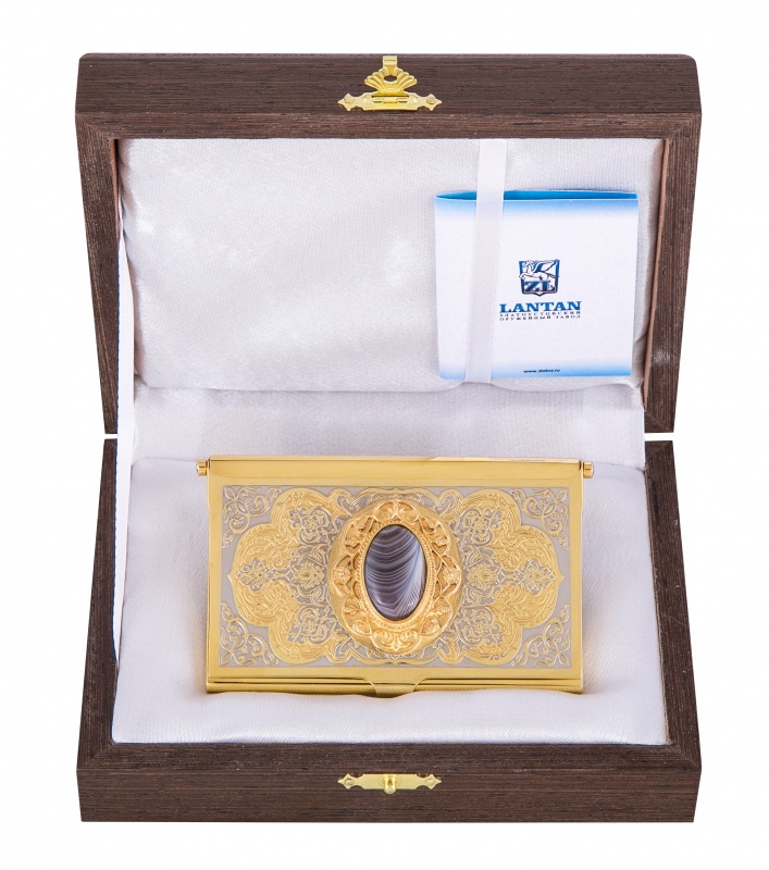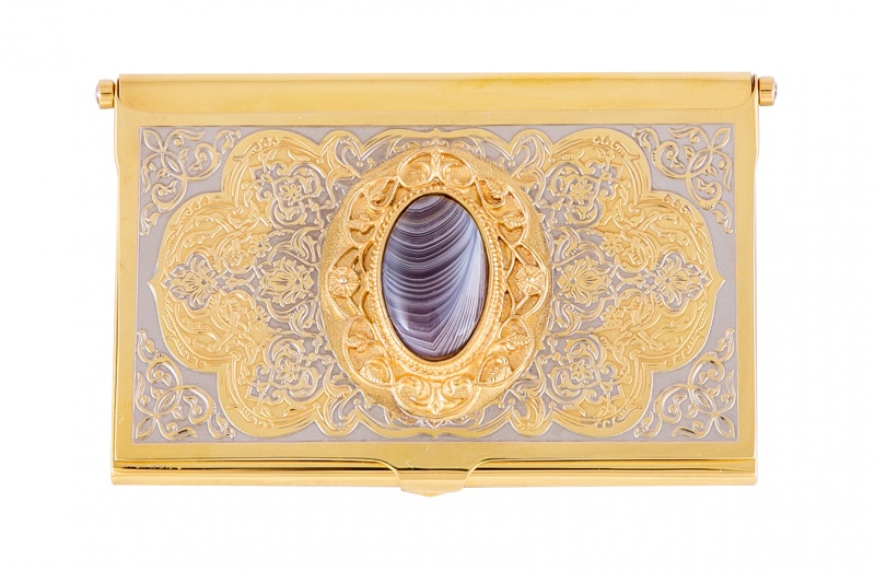 Визитница карманная "агат" (элитная) златоуст. Материал: латунь, агат. Покрытие: золотом 999,9; никелем. Техника исполнения: токарные и слесарные работы, рисовка кистью на металле, многоступенчатая гравировка иглой по лаку, травление, ручная подрезка, полировка. Визитница, инкрустированная натуральным агатом – это не рядовой аксессуар, а настоящее произведение искусства, имеющее функциональную нагрузку. Внутри можно уместить большое количество визиток, которые ежедневно находятся в обиходе. Кроме того, изделие может служить достойным подарком, который наверняка подчеркнет исключительный вкус дарящего и его доброе отношение к получателю сувенира. Размеры: длина - 9,5 см. ширина - 6,3 см. толщина - 1 см. Покрытие Гальванический метод