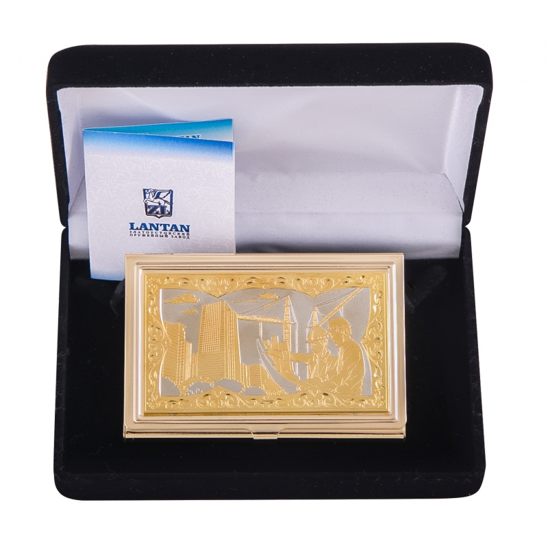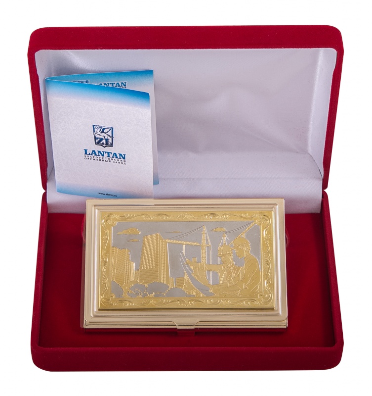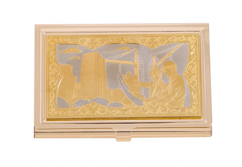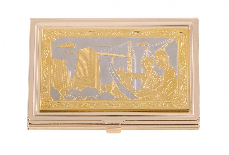 Визитница карманная "строитель" (в ассортименте) златоуст. Материал: латунь. Покрытие: золотом 999,9; никелем. Техника исполнения: токарные и слесарные работы, рисовка кистью на металле, многоступенчатая гравировка иглой по лаку, травление, ручная подрезка, полировка. Такая визитница – неповторимый и оригинальный подарок на День строителя. Выполнена в сложной технике гравировки и ручной росписи, является эксклюзивной ручной работой. Строители, увлеченные своей работой, огромные уже возведенные дома – лицевая гравюра выражает почет к профессии и служит признанием уважения к получателю презента. В этой визитнице удачно объединены красота и функциональность. Размеры: длина - 9,5 см ширина - 6,3 см толщина - 0,8 см Покрытие Гальванический метод