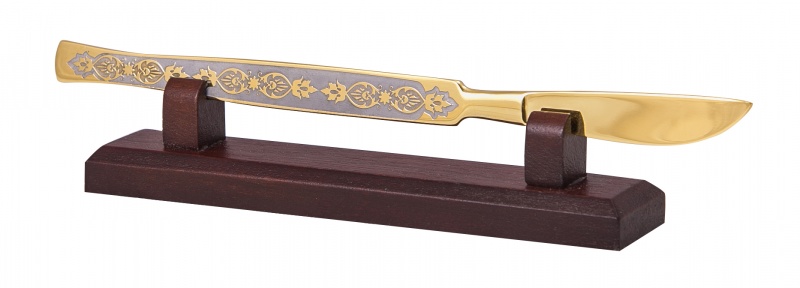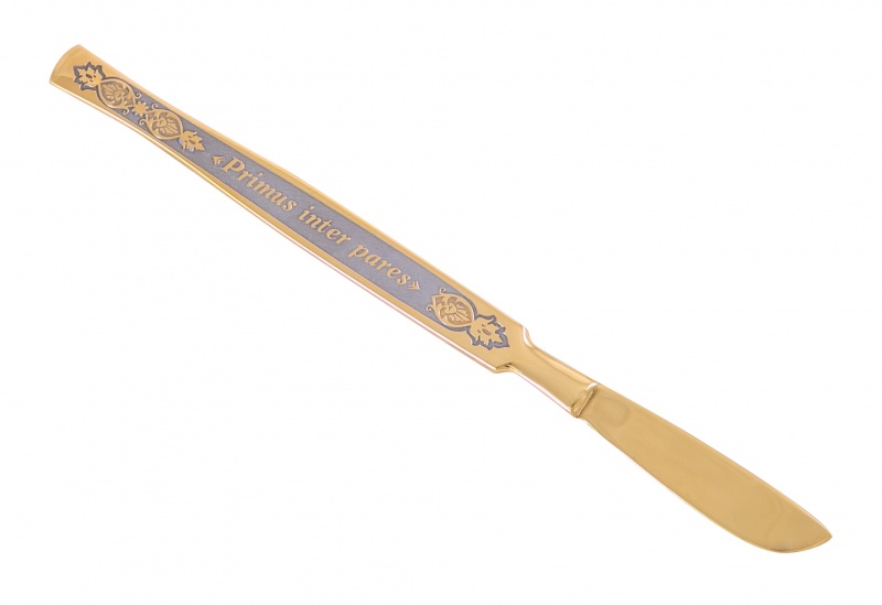 Действительно оригинальный и дорогой подарок врачу. Сувенирный скальпель выполнен из стали с золотым покрытием на подставке из ценных пород дерева, дополнен красивой гравировкой и росписью. На изделии золотыми буквами выложена символичная надпись на латыни «Первый среди равных». Сложно представить себе лучший подарок для талантливого хирурга!