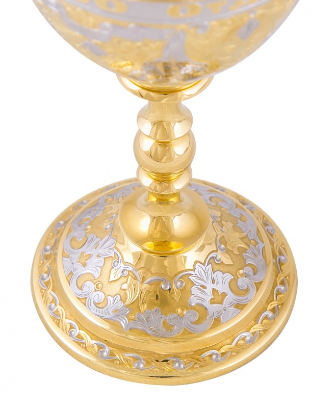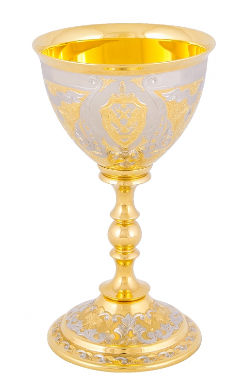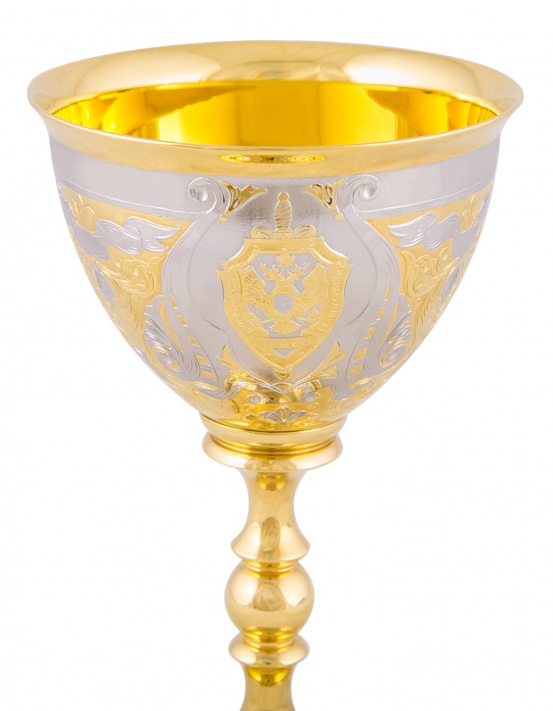 Кубок "фсб" златоуст. Материал: латунь. Покрытие: золотом 999,9; никелем. Техника исполнения: токарные и слесарные работы, рисовка кистью на металле, многоступенчатая гравировка иглой по лаку, травление, ручная подрезка, полировка. Роскошный сувенирный кубок с золотым и никелевым покрытием. Отличный презент для военного или государственного служащего – настоящего патриота своей страны. На чаше кубка изображен герб "ФСБ", композиция дополнена красивым растительным орнаментом. Работа авторская, эксклюзивная – лучшее выражение почтения настоящему мужчине. Размеры: высота - 175 мм. диаметр верхней чаши кубка - 100 мм. диаметр нижней части - 90 мм. Покрытие Гальванический метод