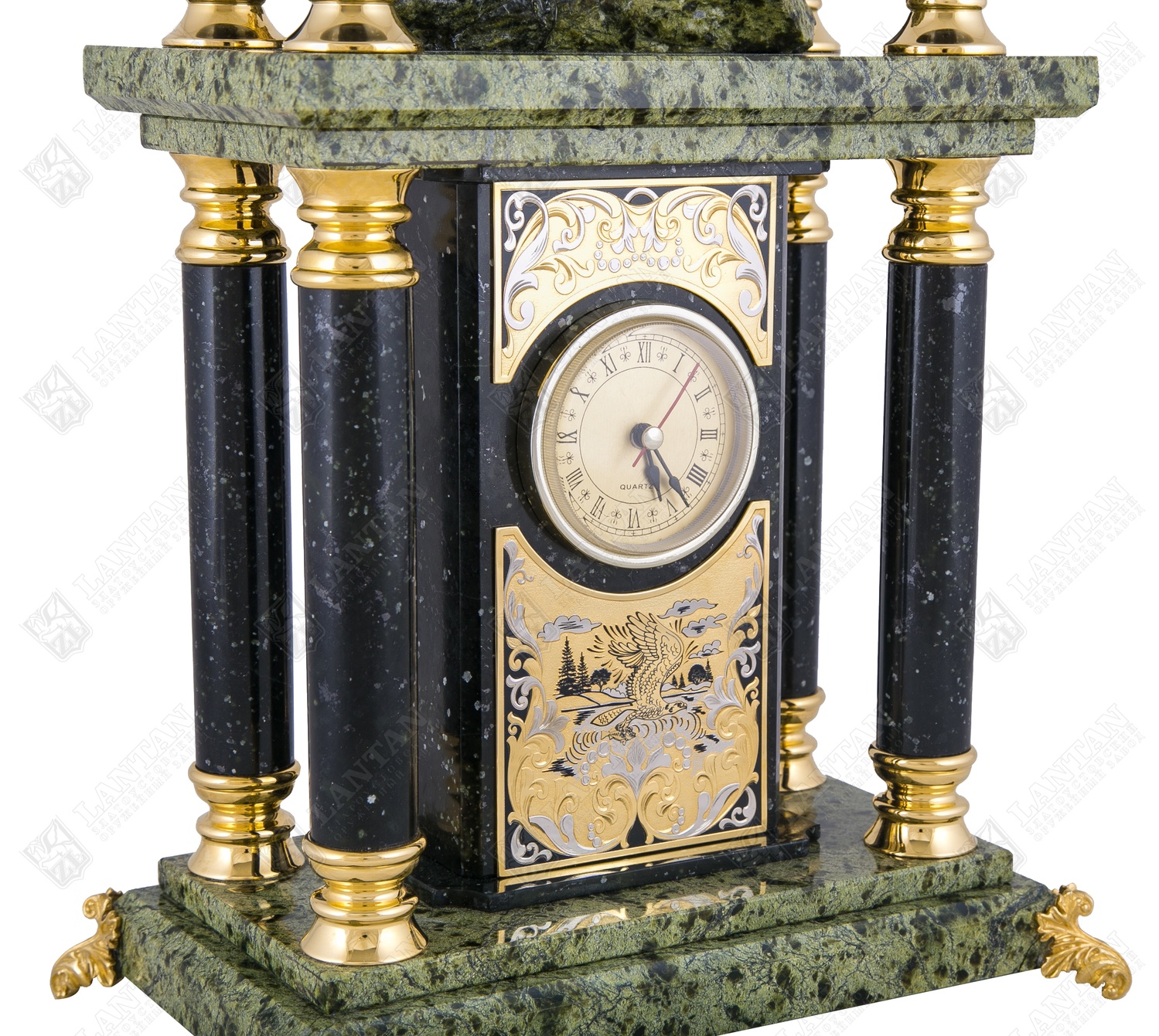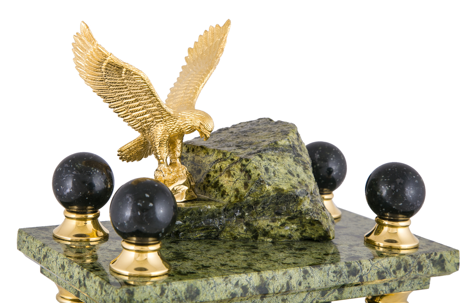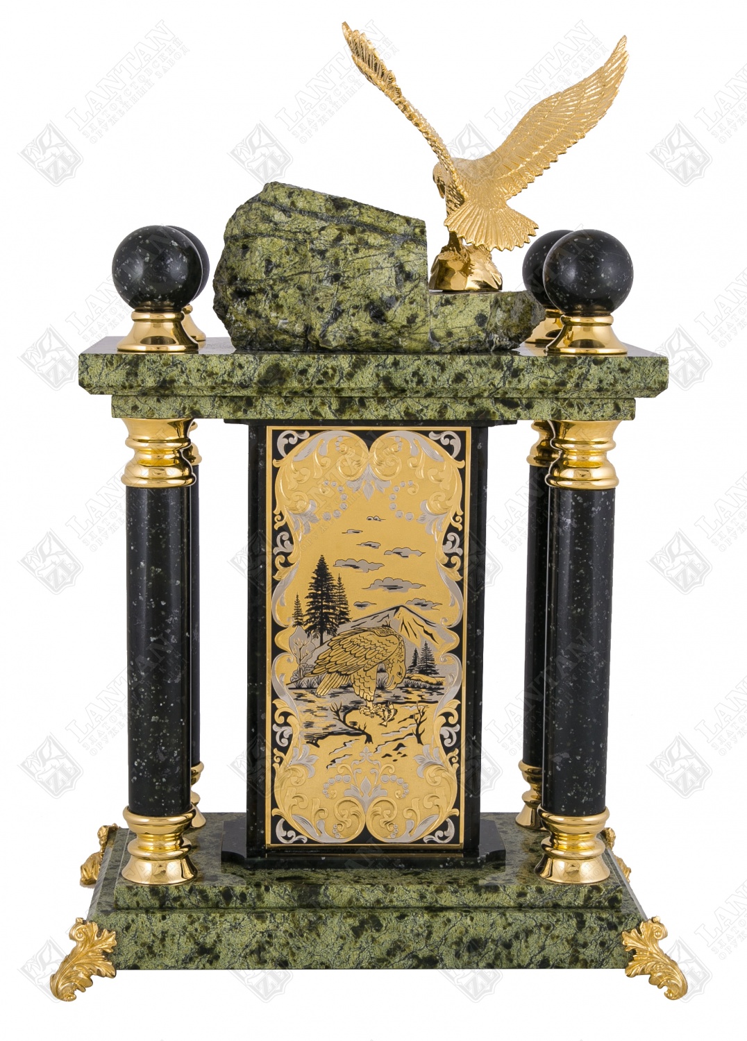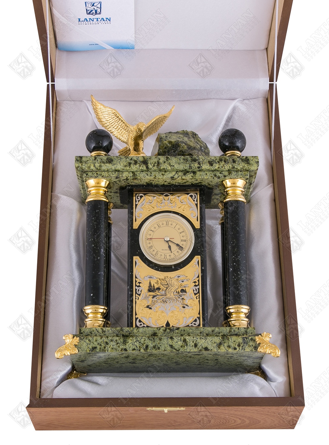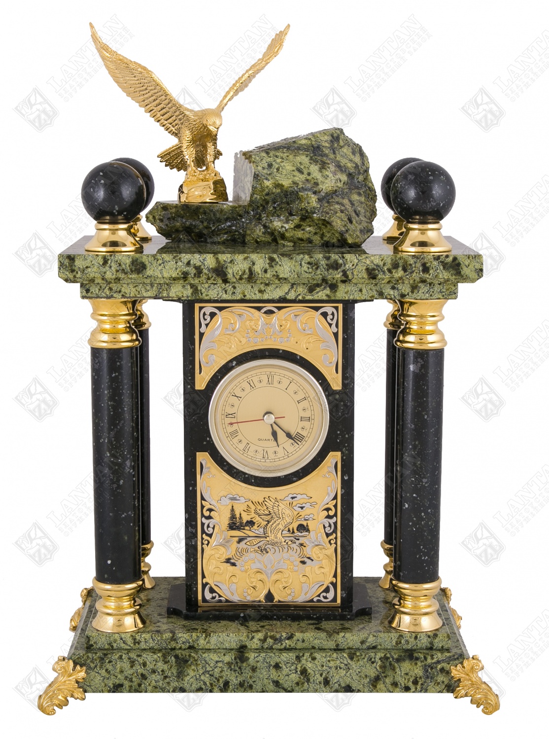 Часы каминные "царь птиц" (змеевик) златоуст. Материал: латунь, змеевик, долерит. Покрытие: золотом 999,9; никелем. Техника исполнения: токарные и слесарные работы, рисовка кистью на металле, многоступенчатая гравировка иглой по лаку, травление, ручная подрезка, полировка. Это подарок на долгие года и даже на века. Роскошные каминные часы из змеевика, долерита и латуни. Главная тема композиции – орел как истинный царь птиц. Изображение орла есть на самом корпусе изделия – на одной стороне птица, гордо взмахнув крыльями мчит над лесами, реками, а на другой – уже держит в цепких лапах новую добычу. Картина передает мощную энергетику и прекрасно дополняет эффектные дорогие часы. Завершением композиции становится фигура орла, который как бы стоит на страже этих часов. Размеры: Высота - 330мм. Ширина - 210 мм. Глубина - 120 мм. Покрытие Гальванический метод