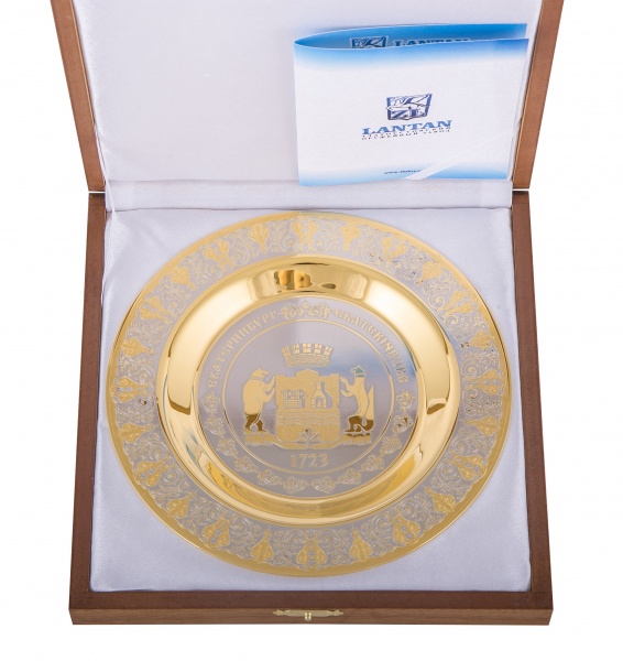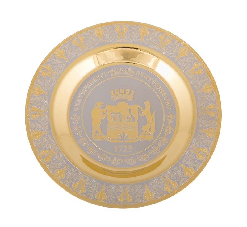Тарель "герб екатеринбурга" гравюра ( диаметр 190мм.). Материал: латунь. Покрытие: золотом 999,9; никелем. Техника исполнения: токарные и слесарные работы, рисовка кистью на металле, многоступенчатая гравировка иглой по лаку, травление, ручная подрезка, полировка. От посещения других городов должны оставаться не только приятные эмоции, но и памятные сувениры. Одним из них наверняка может стать тарель «Герб Екатеринбурга». Все изображения наносятся на поверхность вручную, а само изделие предлагается к приобретению в специальной деревянной упаковке. Такая тарель – это отличный повод вспомнить о любимом городе или позвать туда в гости давних друзей! Размеры: диаметр -190 мм Покрытие Гальванический метод