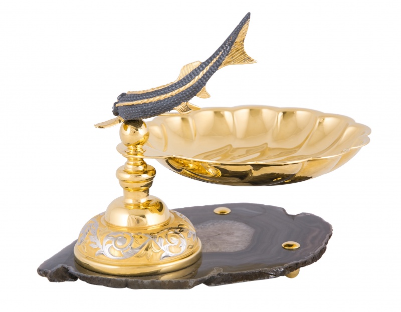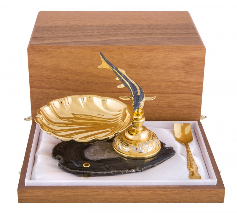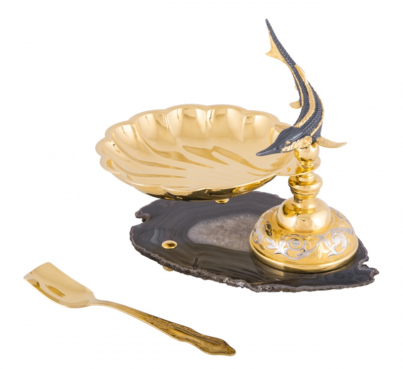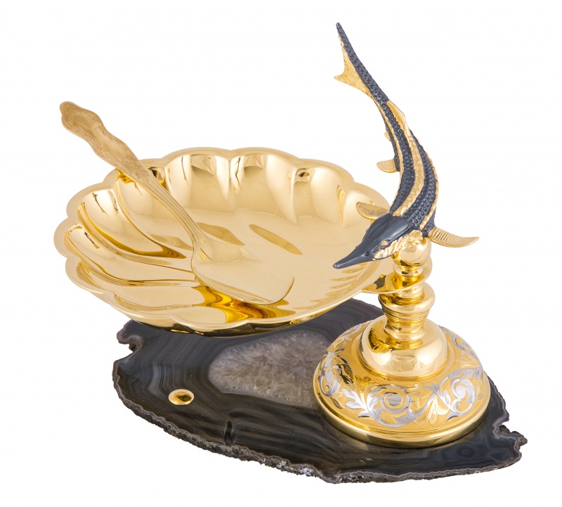Икорница "корейский осётр" (агат). Материал: латунь, агат. Покрытие: золотом 999,9; серебром 925; никелем. Техника исполнения: художественное литье, токарные и слесарные работы, рисовка кистью на металле, многоступенчатая гравировка иглой по лаку, травление, ручная подрезка, полировка. Достойная подача блюда – это половина успеха при попытке впечатлить гостей. Икорница «Корейский осетр» - композиция, которая никогда не выйдет из моды, ведь она идет вне времени! Незамысловатый дизайн добавляет нотку юмора и определенно привлекает внимание. Златоустовские мастера решили отойти от привычного «посудного» оформления и, как показывает практика, им это удалось! Размеры: ширина - 170 мм. высота - 150 мм. Покрытие Гальванический метод