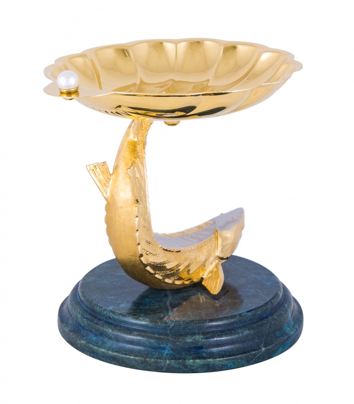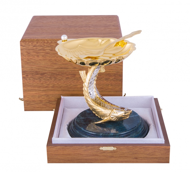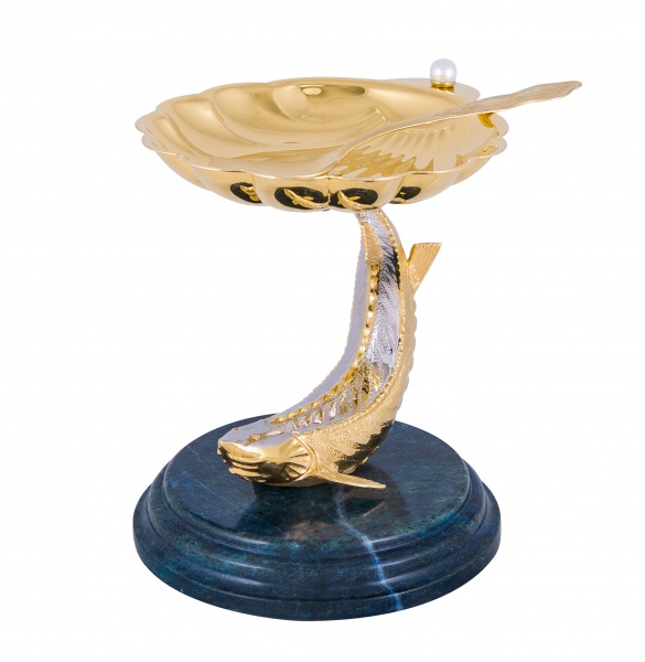 Икорница "жемчужина". Материал: латунь, поделочный камень, жемчуг. Покрытие: золотом 999,9; никелем. Техника исполнения: художественное литье, токарные и слесарные работы, рисовка кистью на металле, многоступенчатая гравировка иглой по лаку, травление, ручная подрезка, полировка. Икорница – это не просто элемент праздничной сервировки стола. «Жемчужина» может стать отличным подарком для людей, не мыслящих своей жизни без гостей, для которых еще предстоит накрыть праздничный стол. Тарель такого рода наверняка привлечет внимание окружающих своим необычным дизайном и соберет уйму комплиментов в пользу хозяев дома! Размеры: ширина - 135 мм. высота - 150 мм. Покрытие Гальванический метод