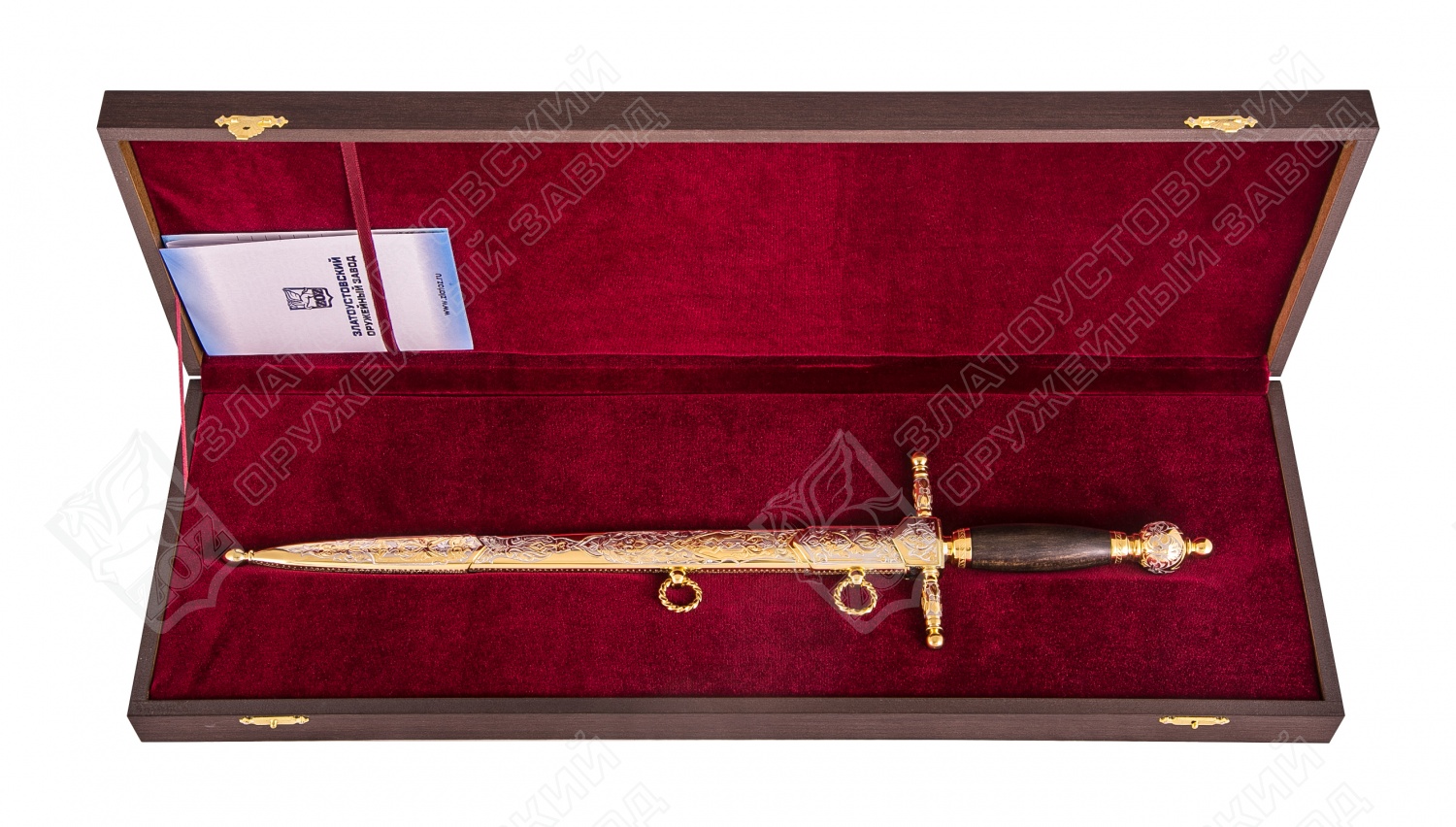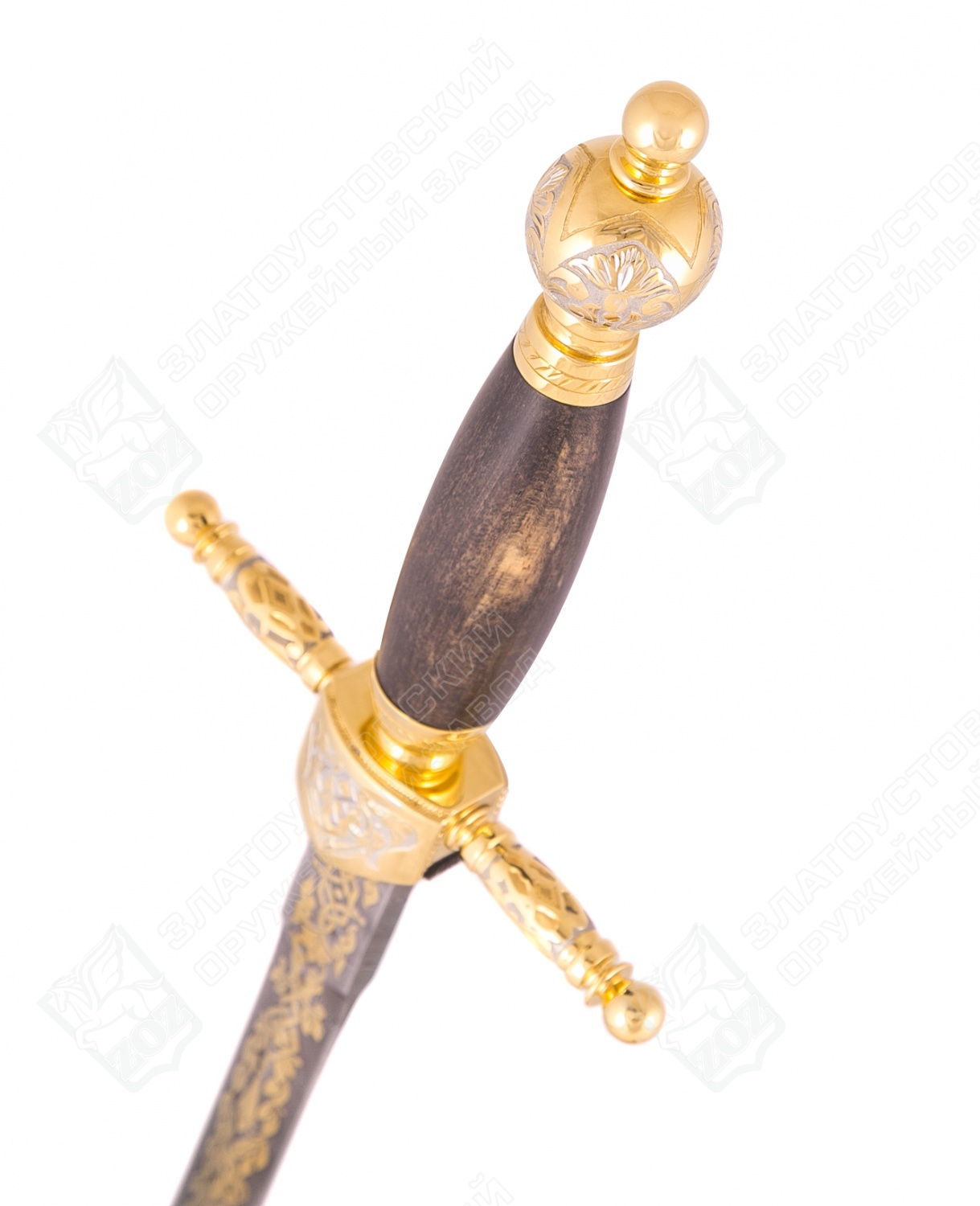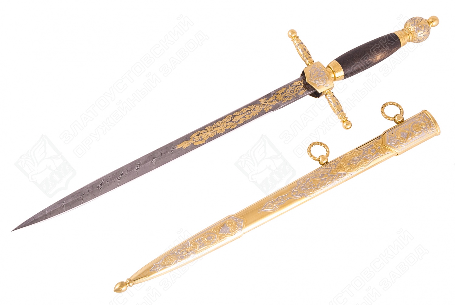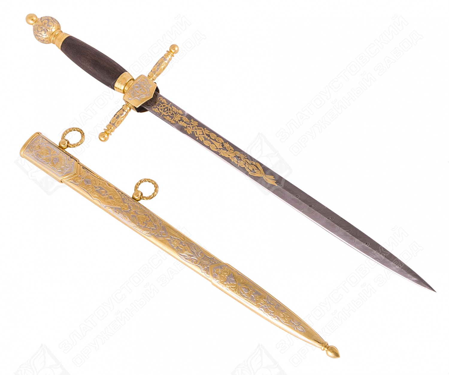 Кортик адмиральский наградной (сталь дамасская). Материал: клинок из дамасской стали; рукоять из ценных пород дерева (Эбен); ножны из латуни. Покрытие: золотом 999,9; никелем. Техника исполнения: токарные и слесарные работы, рисовка кистью на металле, многоступенчатая гравировка иглой по лаку, травление, ручная подрезка, полировка. В детстве кортик был мечтой практически каждого мальчишки… Во взрослой жизни ее не составит труда воплотить тем, кто ищет достойный подарок для представителя сильного пола. Адмиральский кортик «Наградной» выполнен из дамасской стали, имеет рукоять из ценных пород дерева и заключен в ножны из латуни. Здесь нет ничего лишнего! Только холодное величие стали и художественные навыки мастеров. Размеры: общая длина 510 мм. длина клинка 320 мм. ширина клинка 20 мм. ? ×сталь Тип стали Кованая дамасская Покрытие Гальванический метод