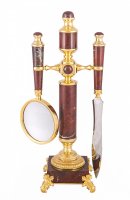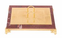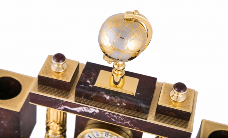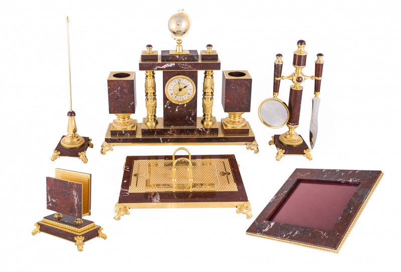 Письменный набор люкс из яшмы. Материал: камень яшма; латунь; инкрустация ювелирными камнями. Покрытия: золотом 999,9; никелем. Техникая исполнения: токарные и слесарные работы, рисовка кистью на металле, многоступенчатая гравировка иглой по лаку, травление, ручная подрезка, полировка. Украшение рабочего кабинета – задача не из легких, тем более, если речь идет о руководящей должности. Можно прокрутить в голове миллион деталей, которые обязательно должны там быть, но первое, на что стоит обратить внимание – это письменный набор. Именно он, выполненный из яшмы и латуни, заполнит собой стол и заставит все свободное пространство работать на своего владельца. Классическая модель дополняет собой любой дизайн интерьера, подчеркивая хороший вкус своего владельца. Покрытие Гальванический метод