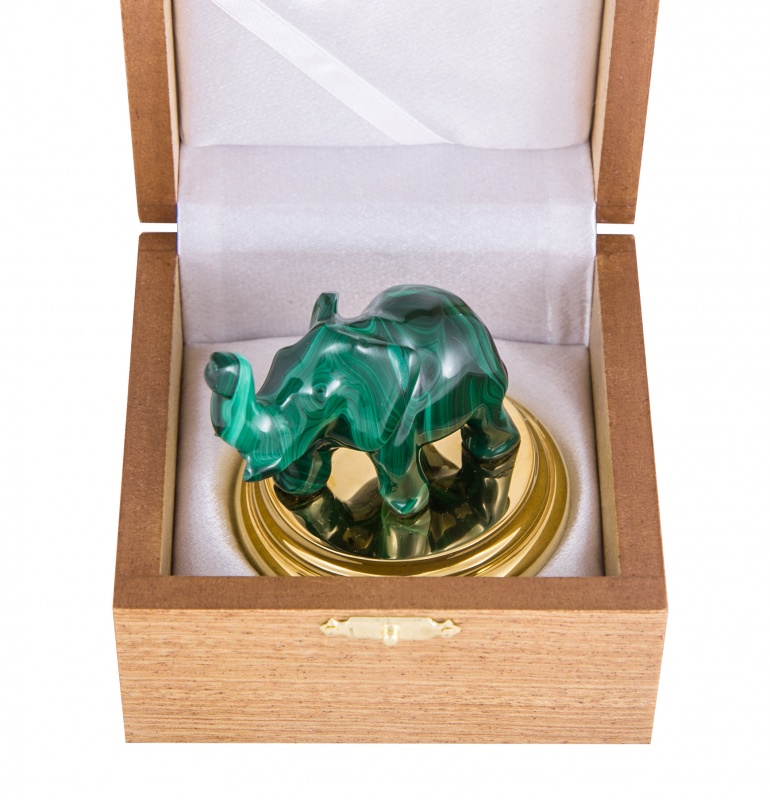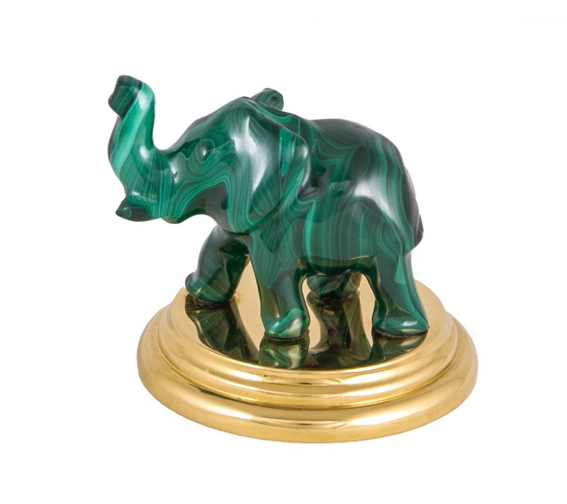 Сувенир "слон" (малахит). Материал: латунь, малахит. Покрытие: золотом 999,9; никелем. Техника исполнения: токарные и слесарные работы, полировка. Материал: латунь, агат, хрусталь. Покрытие: золотом 999,9; никелем. Техника исполнения: художественное литье, токарные и слесарные работы, рисовка кистью на металле, многоступенчатая гравировка иглой по лаку, травление, ручная подрезка, полировка. Размеры: ширина - 35 мм. высота - 60 мм. Покрытие Гальванический метод
