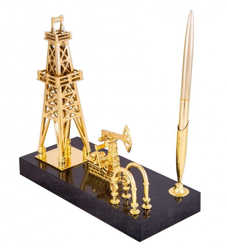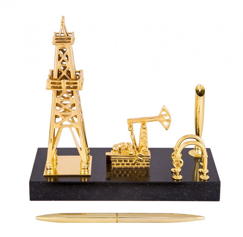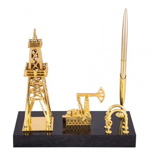 Сувенир вышка - качалка (долерит). Материал: доллерит, латунь. Покрытия: золотом 999,9; никелем. Техника исполнения: токарные и слесарные работы, художественное литье, полировка. Вышка-качалка является прекрасным тематическим презентом для работников нефтепромышленной сферы, тех, кто действительно является фанатом своей профессии. Поставить этот латунный сувенир на подставке из долерита можно в дома или рабочем кабинете. Нет никаких сомнений, что ему найдется место абсолютно в любом интерьере! Размеры: высота 200 мм. ширина 190 мм. глубина 90 мм. Покрытие Гальванический метод