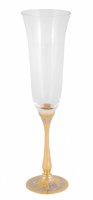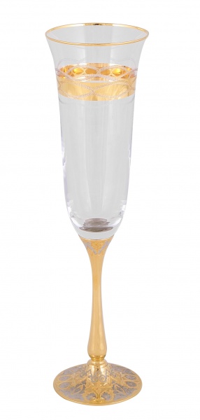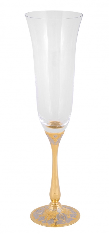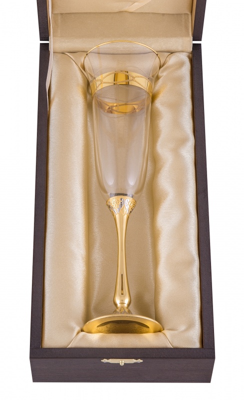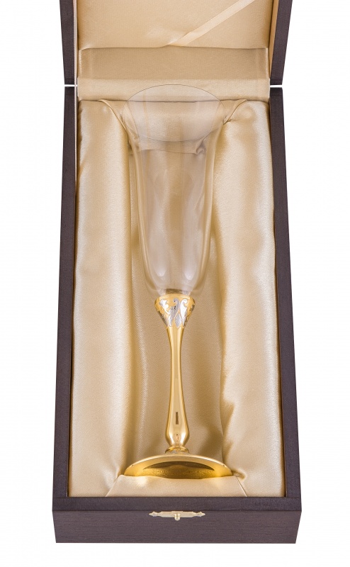 Бокал для шампанского графиня. Материал: латунь, богемское стекло. Покрытие: золотом 999,9; никелем. Техника исполнения: токарные и слесарные работы, рисовка кистью на металле, многоступенчатая гравировка иглой по лаку, травление, ручная подрезка, полировка. Любители игристого вина определенно остановят свое внимание на соответствующем обрамлении для него – бокалов «Графиня». Сочетание богемского стекла, латуни и золотого покрытия делает изделия легкими, практически воздушными. Особую изюминку бокалу добавляет его эксклюзивность – каждое изделие представляет собой ручную работу в которую мастера вкладывают весь свой талант! Размеры: высота - 250мм; ширина - 70 мм. Покрытие Гальванический метод