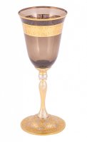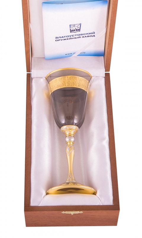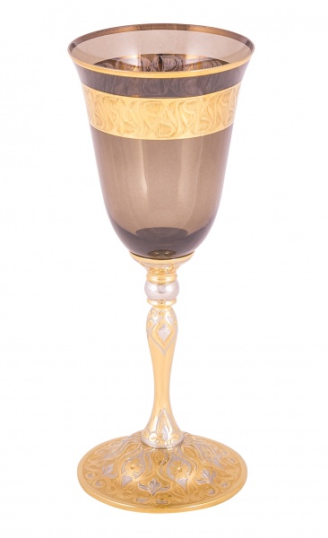 Бокал для вина клевер. Материал: латунь, богемское стекло. Покрытие: золотом 999,9; никелем. Техника исполнения: токарные и слесарные работы, рисовка кистью на металле, многоступенчатая гравировка иглой по лаку, травление, ручная подрезка, полировка. Размеры: высота - 210 мм. ширина - 80 мм. Покрытие Гальванический метод