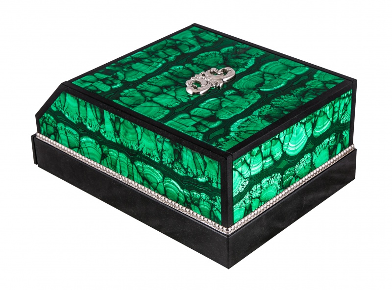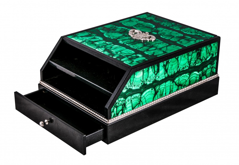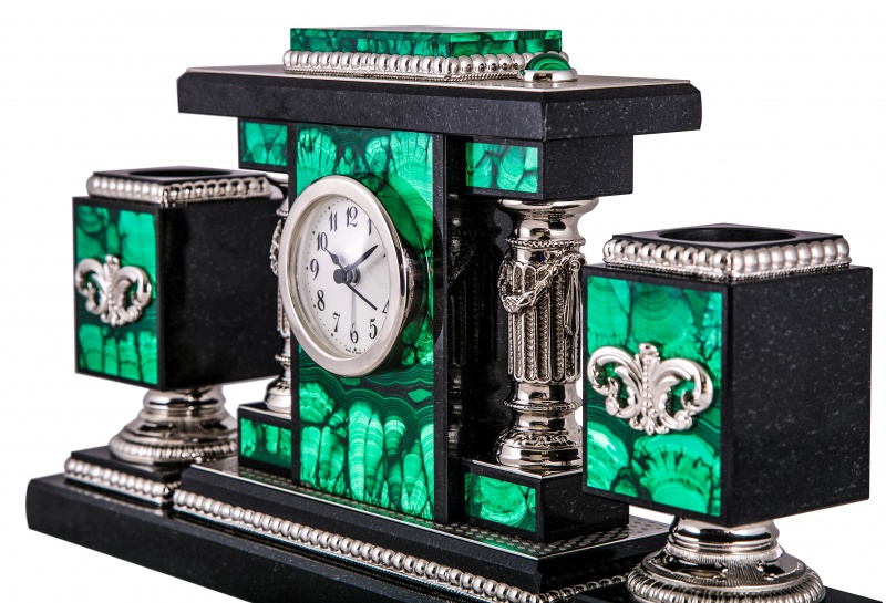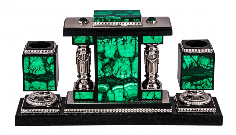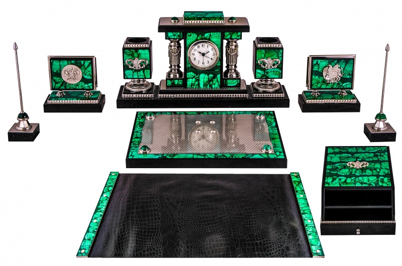 Письменный набор "армения" из малахита. Материал: малахит, латунь, натуральная кожа, долерит. Покрытия: никелем. Техника исполнения: токарные и слесарные работы, рисовка кистью на металле, художественное литье, многоступенчатая гравировка иглой по лаку, травление, ручная подрезка, полировка. Внутри причудливой малахитовой шкатулки хранится настоящее сокровище – письменный набор, состоящий из четырех предметов. Любая, даже самая мелкая деталь, прорабатывается мастерами вручную и доводится до совершенства. И такая щепетильность полностью оправдана, ведь смотрится набор по-настоящему шикарно! Его уж точно можно подарить даже руководителю самого высокого ранга! Размеры: корпус 380х200х90 мм, визитница 125х110х60 мм, календарница 290х20х220 мм, лоток под бумаги 250x130x340 мм. Покрытие Гальванический метод