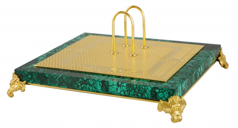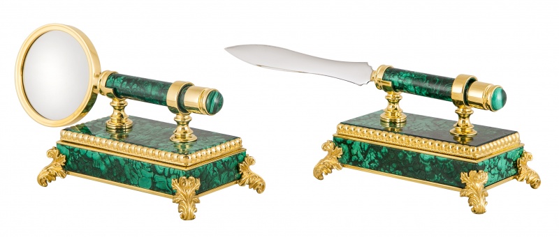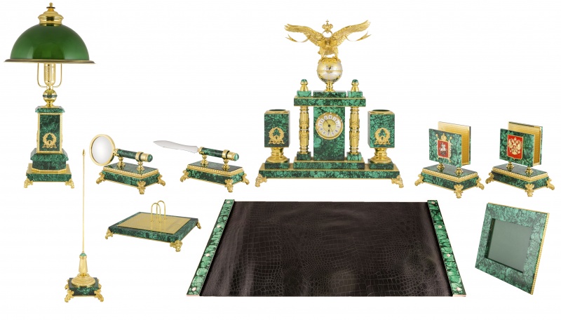 Письменный набор "москва" из малахита. Материал: камень малахит; латунь, эмаль; гербы из серебра; натуральная кожа; инкрустация ювелирными камнями. Покрытия: золотом 999,9; никелем. Техникая исполнения: токарные и слесарные работы, рисовка кистью на металле, многоступенчатая гравировка иглой по лаку, травление, ручная подрезка, полировка. Оформление кабинета руководителя – задача не из легких, ведь каждая мелочь должна играть на формирование положительного имиджа своего владельца. Письменный набор «Москва», в котором идеально сочетаются натуральные камни, серебро и кожа, имеет не только эстетическое, но и практическое назначение. И он – то уж наверняка станет достойным жителем рабочего кабинета. Размеры: корпус 380х400х90 мм, визитница 130х110х70 мм, календарница 250х20х220 мм, подставки под лупу и нож 125x20x70 мм, фоторамка 270x220 мм. Покрытие Гальванический метод