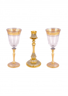 Набор винный вдвоем (2 бокала, подсвечник). Материал: латунь, богемское стекло. Покрытие: золотом 999,9; никелем. Техника исполнения: токарные и слесарные работы, рисовка кистью на металле, многоступенчатая гравировка иглой по лаку, травление, ручная подрезка, полировка. Задать романтическую обстановку могут не только люди, но и окружающие их предметы. Винный набор Наедине» - это возможность рассказать второй половинке о чувствах, показать ей новые грани своей любви. Помимо бокалов в наборе идет еще и подсвечник, который сделает свидание еще более романтичным и необычным. Покрытие Гальванический метод Вес брутто, кг 3.5