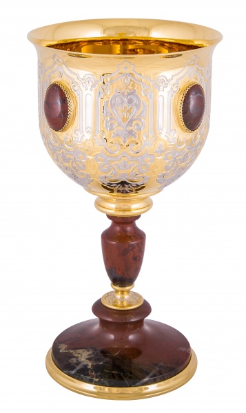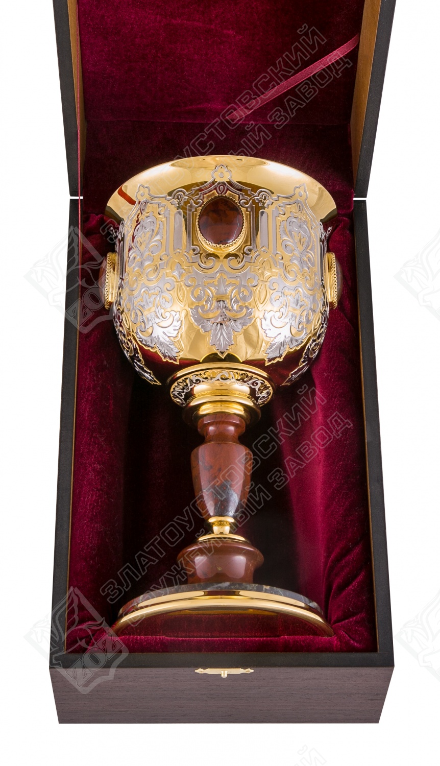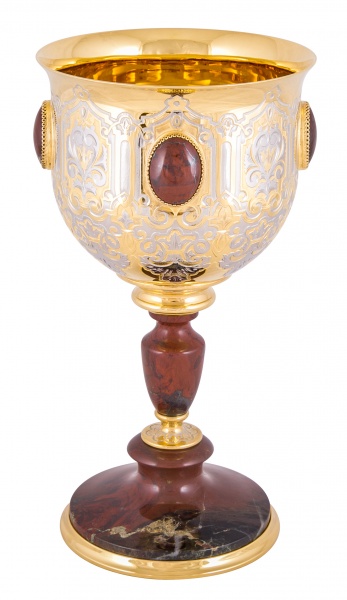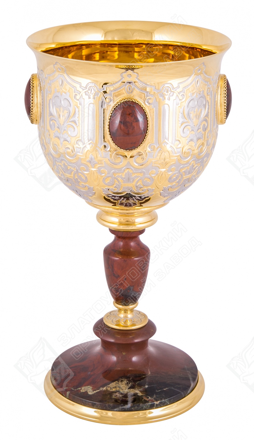 Кубок победитель. Материал: латунь, камень используемый яшма. Покрытие: золотом 999,9; никелем. Техника исполнения: токарные и слесарные работы, рисовка кистью на металле, многоступенчатая гравировка иглой по лаку, травление, ручная подрезка, полировка, чернение латуни. Стремящимся быть первыми всегда и во всем просто необходима соответствующая награда, которой запросто может стать кубок «Победитель» от Златоустовского оружейного завода. Изделие из латуни и яшмы определенно займет достойное место в интерьерном решении, всегда будет служить напоминанием о том, что во всех важных жизненных ситуациях необходимо бороться за первые места! Размеры: высота - 280 мм; наибольший диаметр - 145 мм. Покрытие Гальванический метод