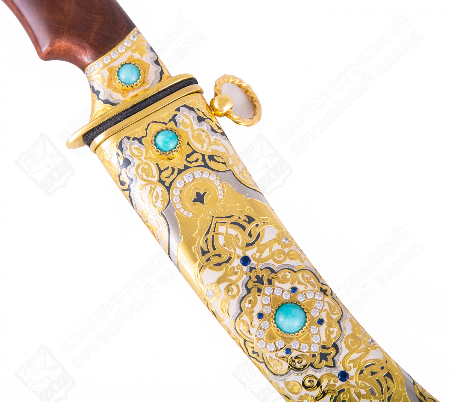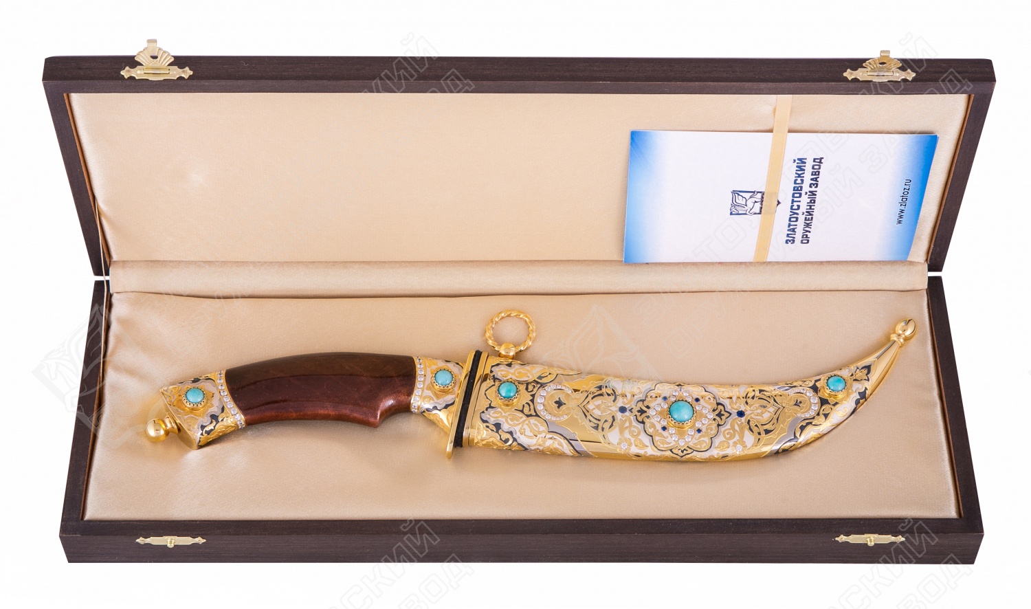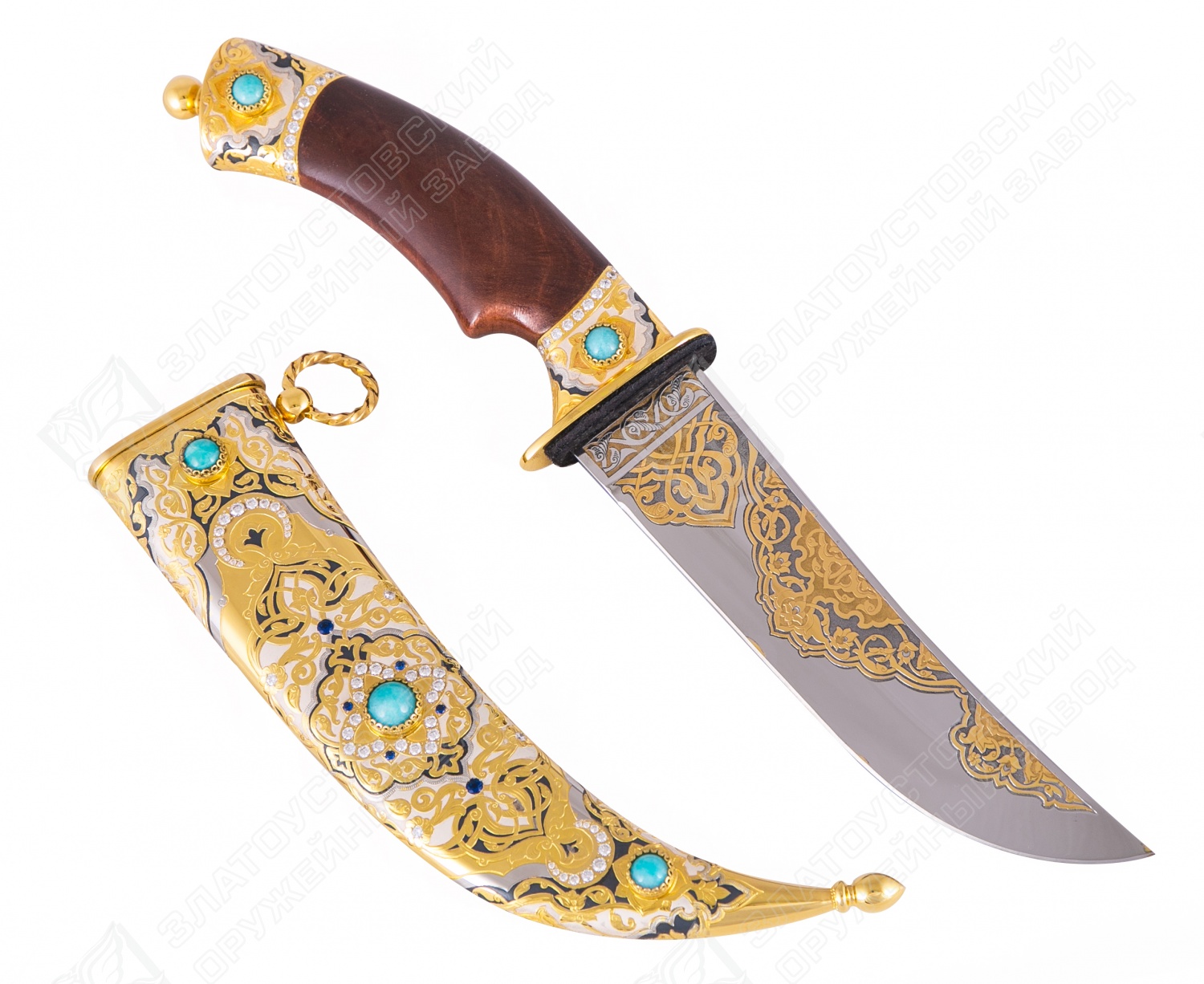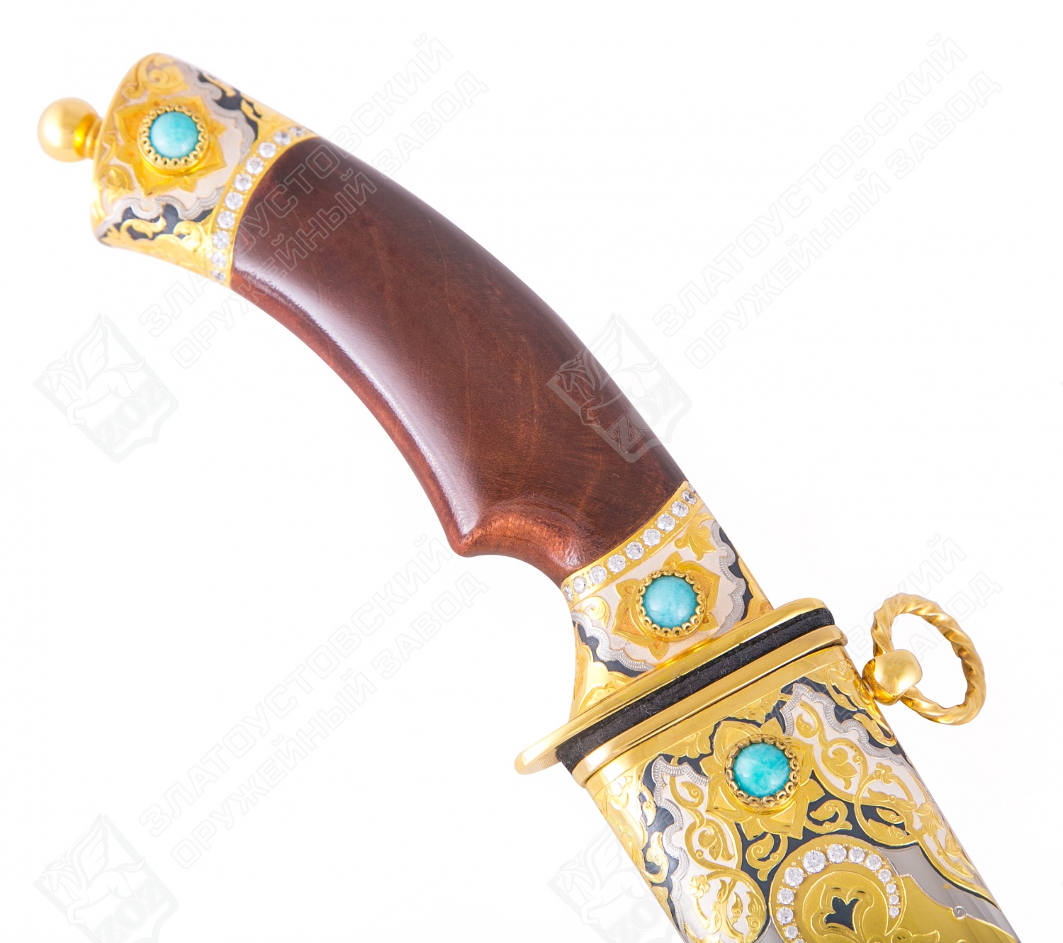 Нож цм луна (сталь нержавеющая эи-107). Материал: клинок из стали ЭИ-107 (закалка 55 ед. по шкале Роквелла); ножны - латунь; рукоять - орех; кабошоны бирюза; инкрустация ювелирными камнями. Покрытие: золотом 999,9; серебром 999.9; никелем. Техника исполнения: токарные и слесарные работы, рисовка кистью на металле, многоступенчатая гравировка иглой по лаку, травление, ручная подрезка, полировка, чернение латуни. Ножи… Кухонные, охотничьи, разделочные…У каждого из них своя технология изготовления, предназначение и цена. А как насчет коллекционных изделий? Некоторые из них обречены лежать в коробках, другие достают любоваться вновь и вновь. Именно к числу последних относится «Луна» - нож, в котором умело сочетаются бирюза, ювелирные камни и холод металла. Такой подарок можно дополнить дарственной надписью, что сделает его еще ценнее для получателя. Размеры: общая длина - 380 мм. длина клинка - 170 мм. ширина клинка - 35 мм. ? ×сталь Тип стали Кованая нержавеющая 40Х10С2М(ЭИ-107) Покрытие Гальванический метод