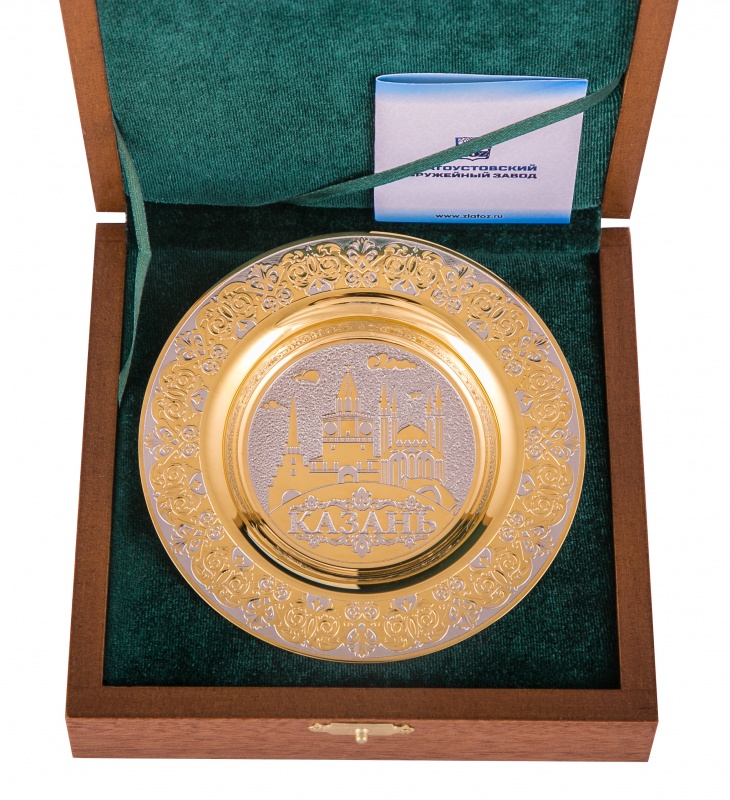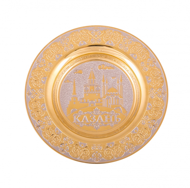 Тарель казань гравюра ( диаметр 110мм.). Материал: латунь. Покрытие: золотом 999,9; никелем. Техника исполнения: токарные и слесарные работы, рисовка кистью на металле, многоступенчатая гравировка иглой по лаку, травление, ручная подрезка, полировка. Любителей коллекционировать тарелки с изображениями разных городов с каждым годом становится все больше, поэтому Златоустовские мастера поспешили порадовать интересующихся своей новой разработкой. Тарель «Казань» выполнена из латуни, покрыта золотом и расписана вручную. На ней изображен логотип столицы Татарстана, величественной и, одновременно, пронизывающей своим колоритом. Конечно, ее можно использовать по прямому назначению, но зачем, если она может занять достойное место в качестве украшения? Размеры: диаметр -110 мм. Покрытие Гальванический метод