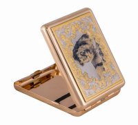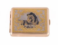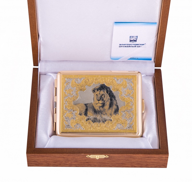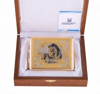 Портсигар лев. Материал: латунь. Покрытие: золотом 999,9; никелем. Техника исполнения: слесарные работы, рисовка кистью на металле, многоступенчатая гравировка иглой по лаку, травление, чернения латуни, ручная подрезка, полировка. Портсигар – ведь удобная, о которой наверняка мечтает каждый второй курильщик. Но купить его себе предпочитают далеко не все: нет лишних денег, времени, желания ходить в поисках нужного. Именно поэтому «Лев» может стать прекрасным подарком: он вместительный, удобный, не гнется и не тускнеет. Крышка украшена изображением льва, которое не является переводной картинкой: мастера рисуют все самостоятельно, добиваясь максимальной реалистичности даже в деталях. Размеры: длина - 100 мм. ширина - 80 мм. толщина - 20 мм. Покрытие Гальванический метод