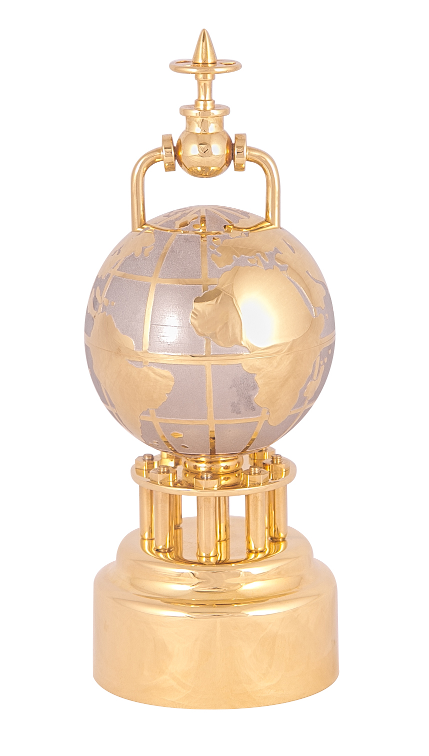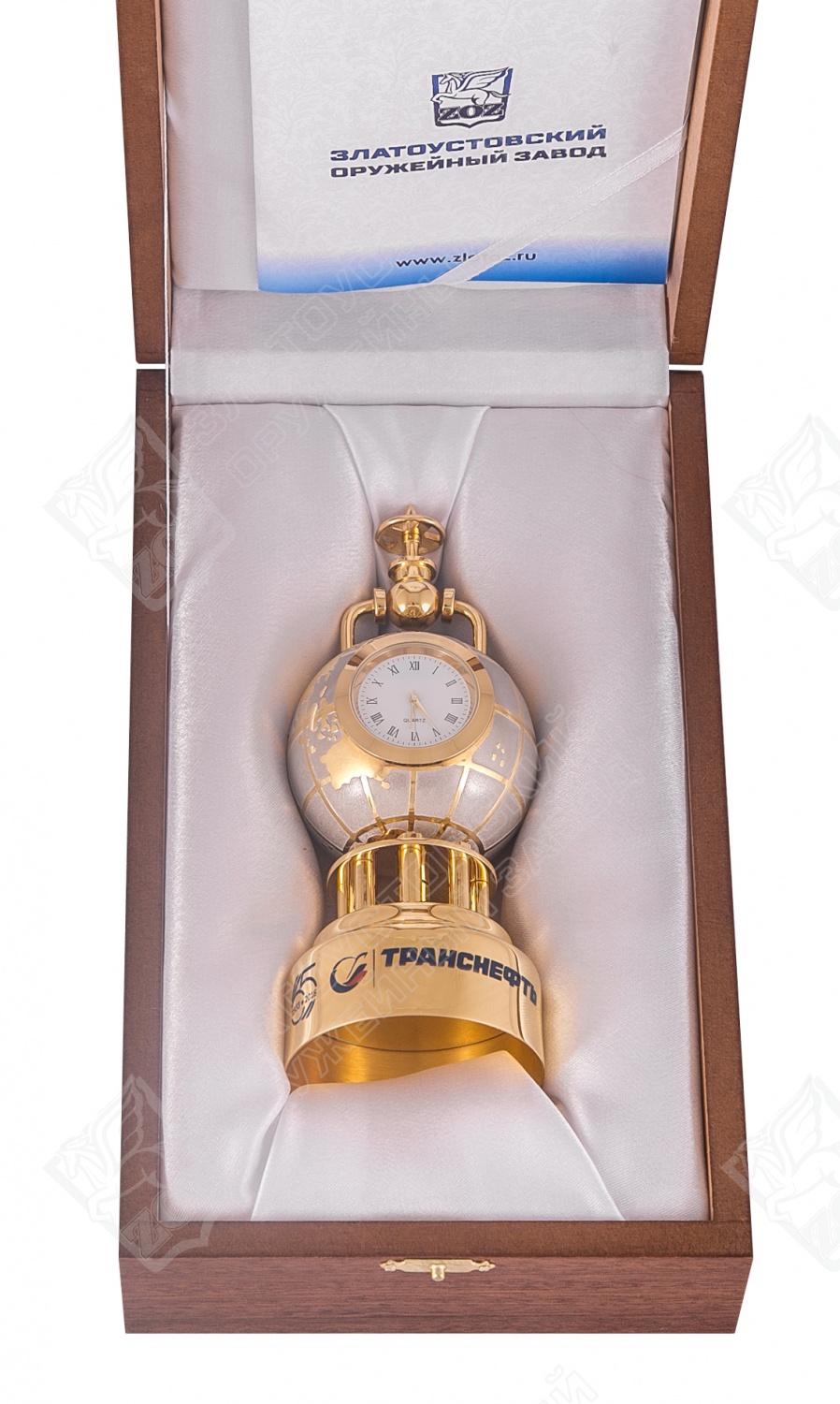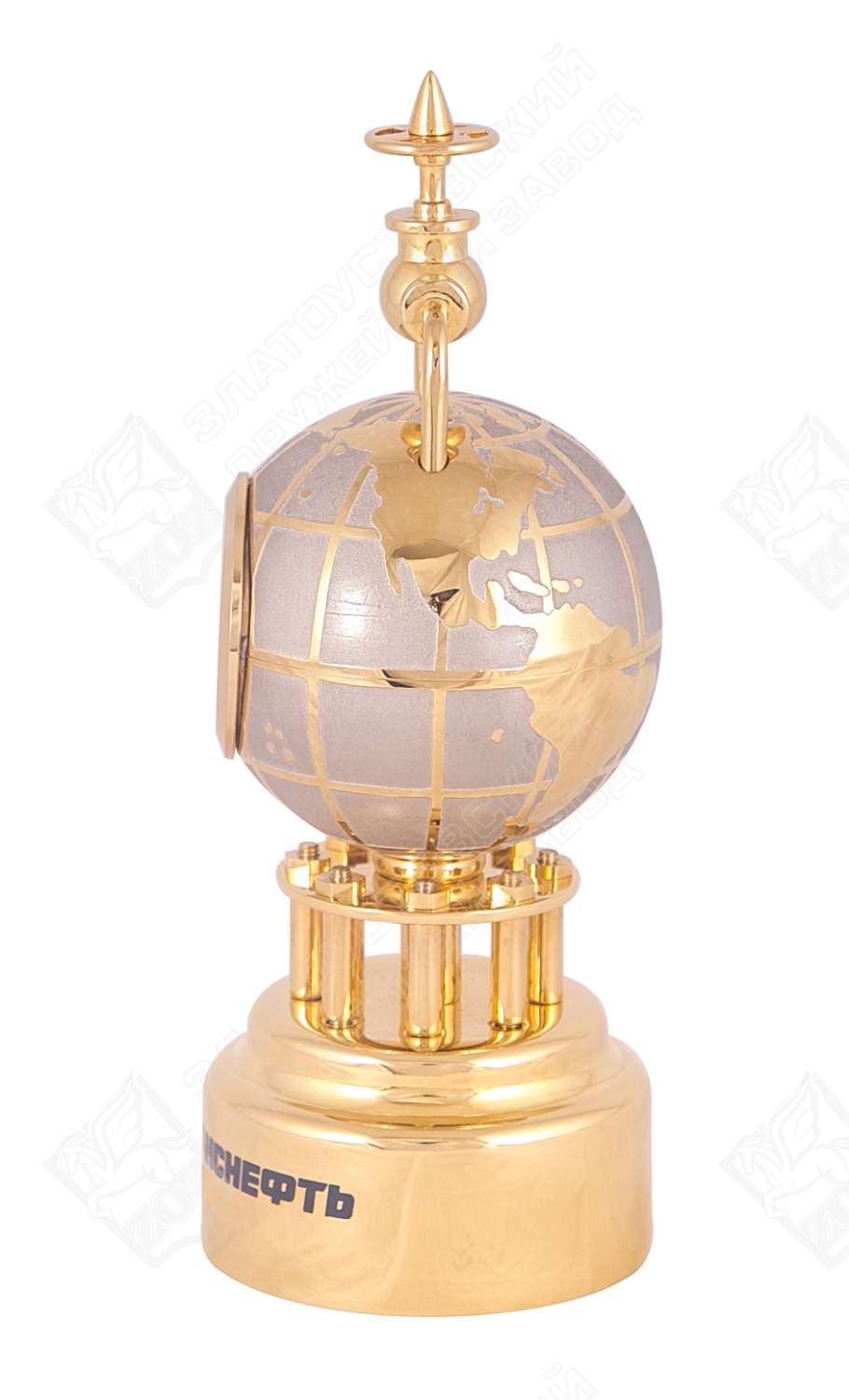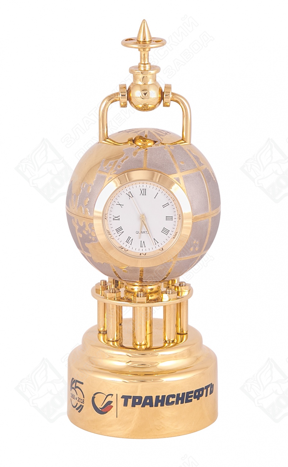 Часы транснефть. Материал: латунь. Покрытие: золотом 999,9; никелем. Техника исполнения: токарные и слесарные работы, рисовка кистью на металле, многоступенчатая гравировка иглой по лаку, травление, ручная подрезка, полировка. Размеры: высота - 160 мм; наибольший диаметр - 60 мм. Покрытие Гальванический метод