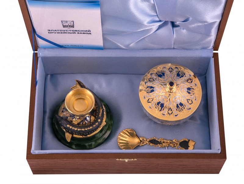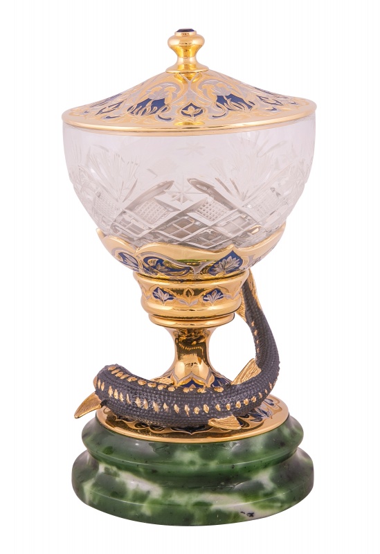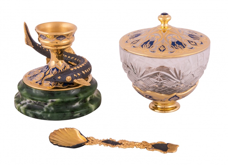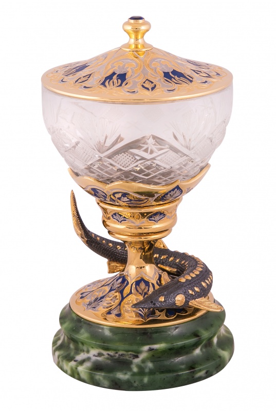 Икорница черноморский осётр (нефрит). Материал: латунь, нефрит, хрусталь, эмаль. Покрытие: золотом 999,9; серебром 925; никелем. Техника исполнения: художественное литье, токарные и слесарные работы, рисовка кистью на металле, многоступенчатая гравировка иглой по лаку, травление, ручная подрезка, полировка. Умение не только вкусно готовить, но и привлекательно сервировать стол – это настоящее искусство, воплощению которого поможет правильно подобранная посуда. Икорница «Черноморский осетр» - желанный гость на каждом праздничном столе. Композиция «начинается» с нефритовой подставки на которой латунный осетр – самый большой представитель своего рода. На вершине – хрустальная чаша, куда и будет складываться икра. В ожидании гостей ее можно накрыть расписанной вручную крышечкой. Столь необычные вещи – это не просто посуда. Это предметы декора, которые не потеряют своей актуальности и через года. Размеры: ширина - 110 мм. высота - 190 мм. Покрытие Гальванический метод