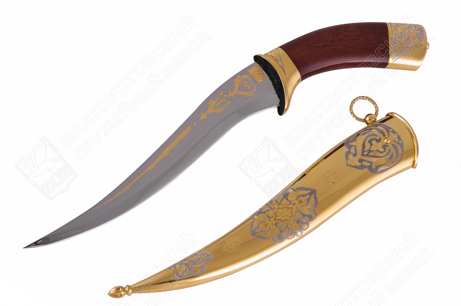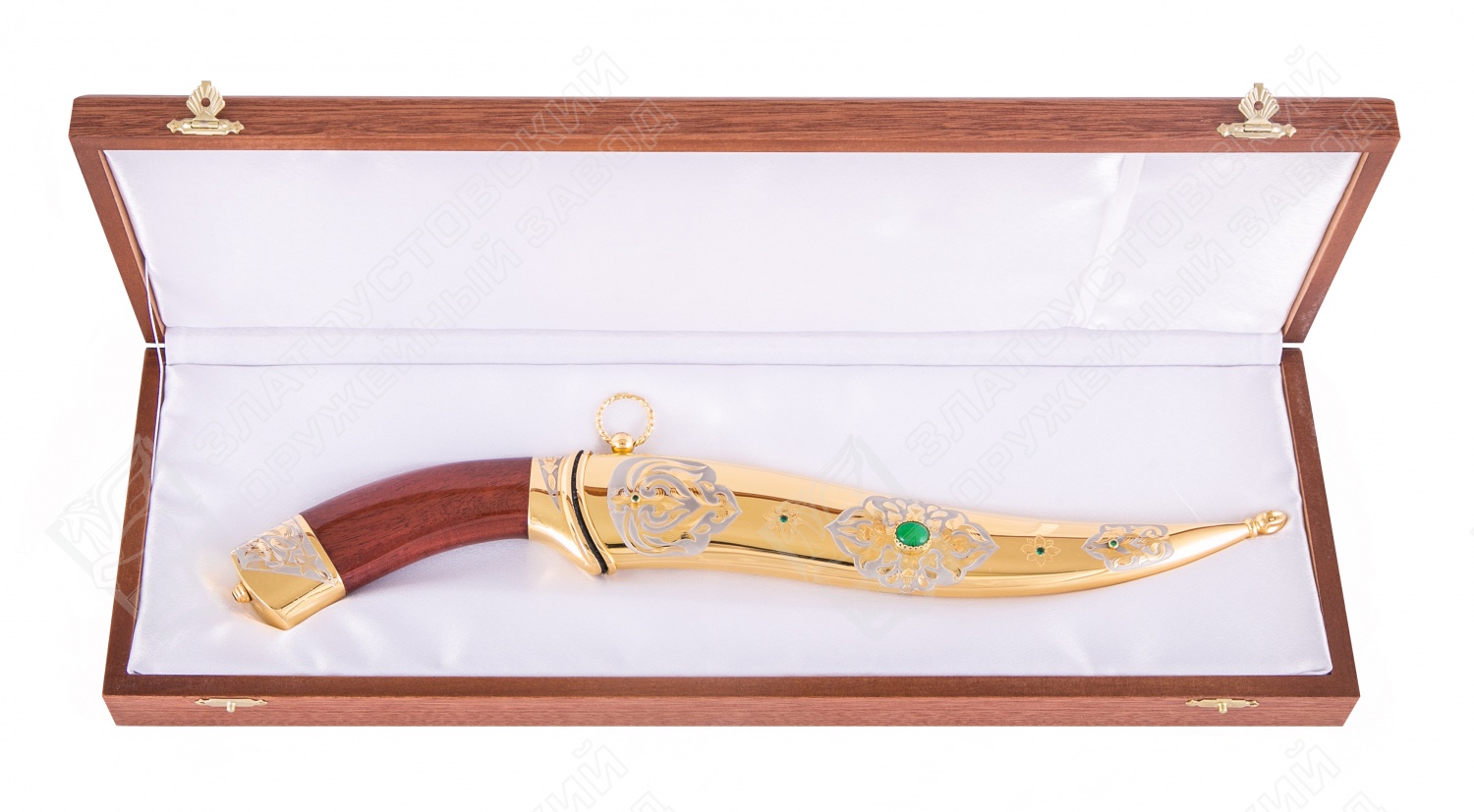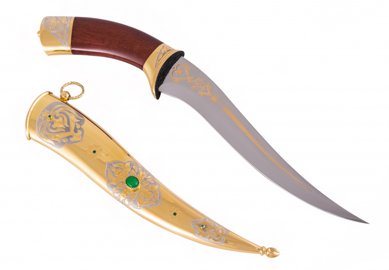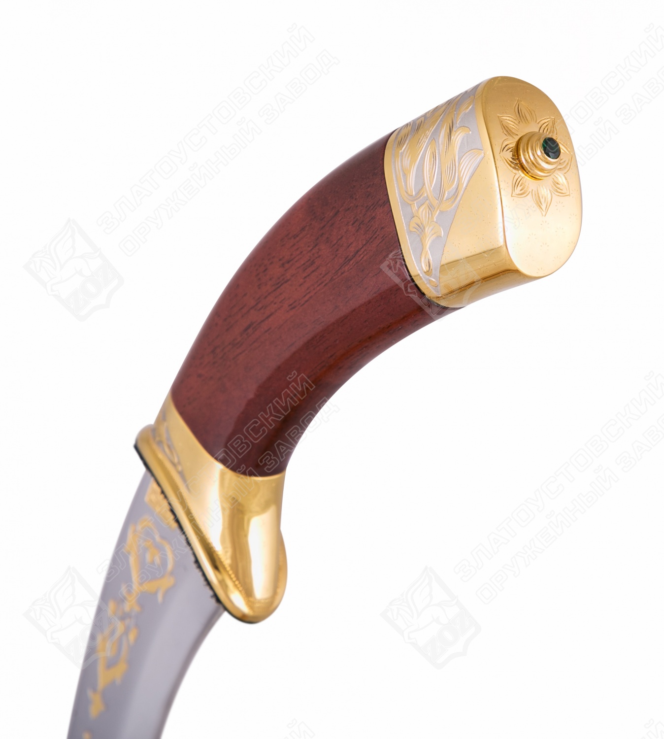 Нож цм восток (сталь нержавеющая эи-107). Материал: клинок из стали ЭИ-107 (закалка 55 ед. по шкале Роквелла); ножны из латуни; инкрустация ювелирными камнями; рукоять из ценных пород дерева. Покрытие: золотом 999,9; никелем. Техника исполнения: токарные и слесарные работы, рисовка кистью на металле, многоступенчатая гравировка иглой по лаку, травление, ручная подрезка, полировка, чернение латуни. Размеры: общая длина - 390 мм. длина клинка - 220 мм. ширина клинка - 36 мм. ? ×сталь Тип стали Кованая нержавеющая 40Х10С2М(ЭИ-107) Покрытие Гальванический метод