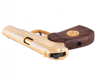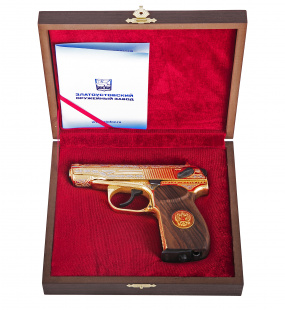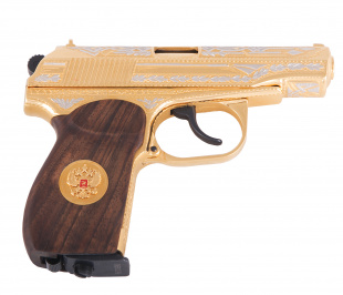 Пистолет макарова (пм) рф. Материал: латунь, сапеле - ценные породы дерева. Покрытие: золотом 999,9; никелем. Техника исполнения: токарные и слесарные работы, рисовка кистью на металле, многоступенчатая гравировка иглой по лаку, травление, ручная подрезка, полировка. Размеры: высота -125 мм ширина - 30 мм длина - 165 мм Покрытие Гальванический метод Вес брутто, кг 1.4