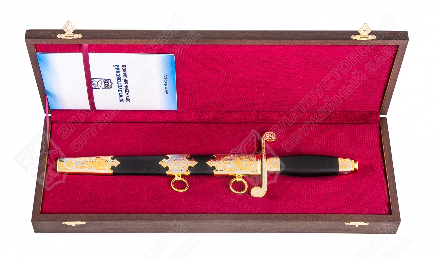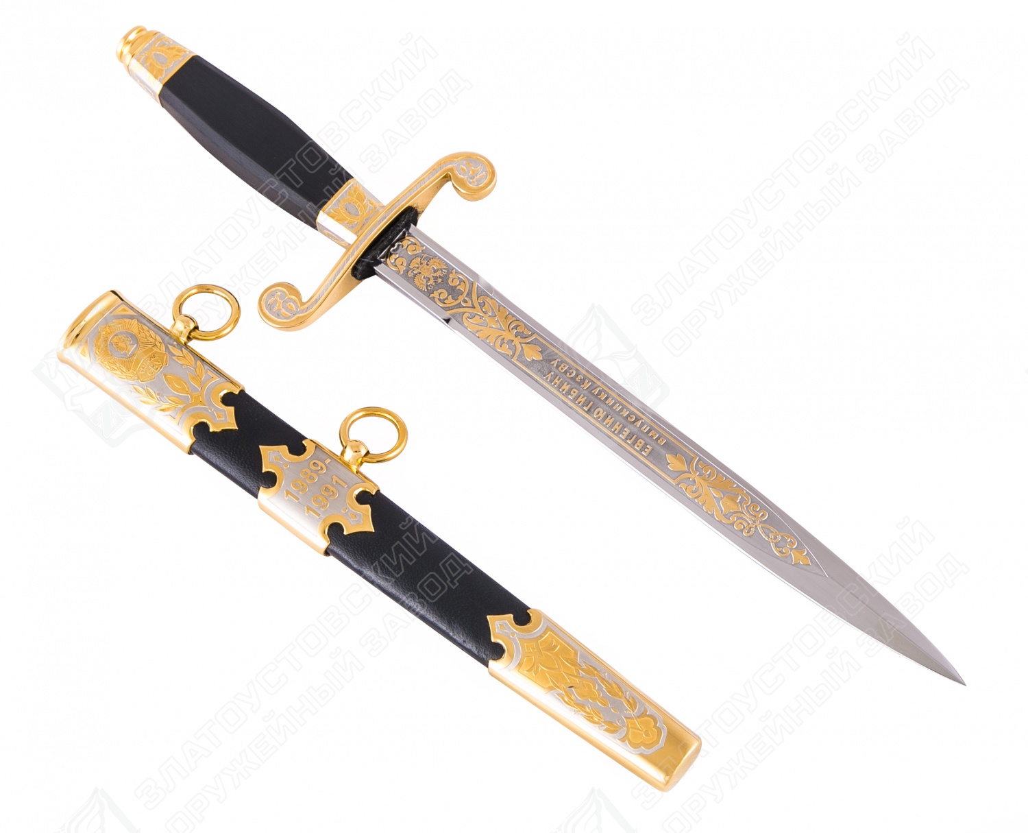 Кортик офицерский кзсву (сталь нержавеющая эи-107, ножна кожа). Материал: клинок из нержавеющей стали; рукоять из граба; ножны кожа и латунь. Покрытие: золотом 999,9; никелем. Техника исполнения: токарные и слесарные работы, рисовка кистью на металле, многоступенчатая гравировка иглой по лаку, травление, ручная подрезка, полировка. Размеры: общая длина 360 мм. длина клинка 230 мм. ширина клинка 17 мм. ? ×сталь Тип стали Кованая нержавеющая 40Х10С2М(ЭИ-107) Покрытие Гальванический метод