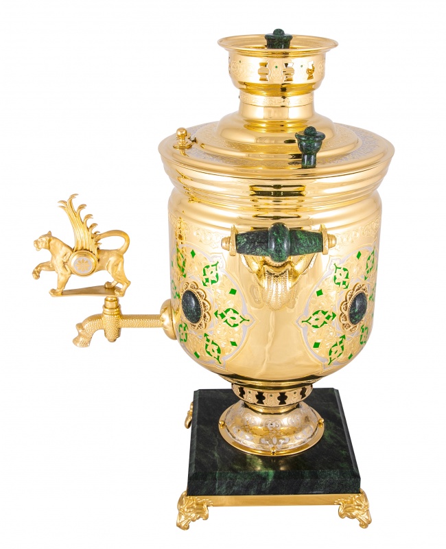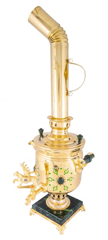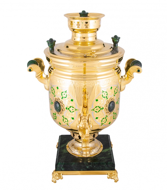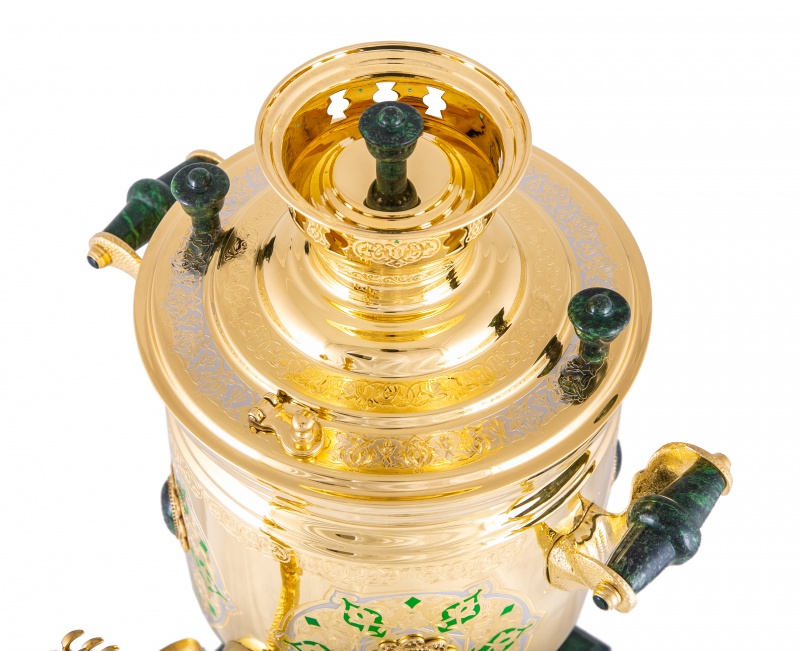 Самовар татарстан (5 литров, угольный, змеевик). Материал: латунь, змеевик, фианиты. Покрытие: золотом 999,9; никелем. Техника исполнения: токарные работы, рисовка кистью на металле, многоступенчатая гравировка иглой по лаку, травление, ручная подрезка, полировка. Размеры: Ширина — 300 мм. Высота — 520 мм.