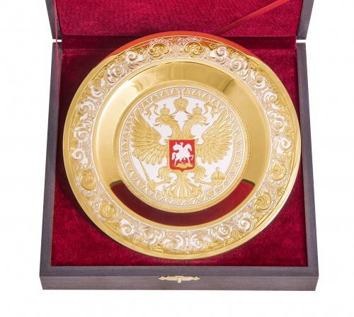 Тарель герб россии (диаметр 190 мм). Материал: латунь. Покрытие: золотом 999,9; никелем. Техника исполнения: токарные и слесарные работы, рисовка кистью на металле, многоступенчатая гравировка иглой по лаку, травление, ручная подрезка, полировка. Размеры: диаметр -190 мм. Покрытие Гальванический метод