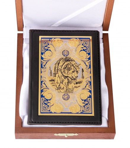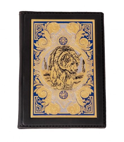 Обложка для паспорта медведь. Материал: латунь, натуральная кожа. Покрытие: золотом 999,9; никелем. Техника исполнения: токарные и слесарные работы, рисовка кистью на металле, многоступенчатая гравировка иглой по лаку, травление, ручная подрезка, полировка. Обложка для паспорта из натуральной кожи - отличный аксессуар для самого главного документа любого человека. Обложка защитит паспорт от многих неблагоприятных воздействий и поможет сохранить первозданный вид. Качественная кожа с тиснением, твердая обложка, по краям прошита нитью. Внутри дополнительный карман для 2х кредитных карт. Размеры: высота - 133 мм. ширина - 96 мм.