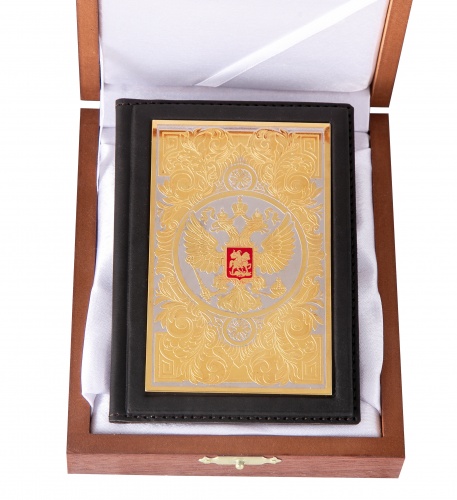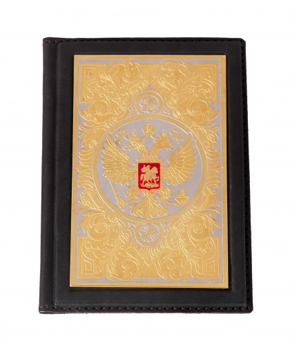 Обложка для паспорта герб рф. Материал: латунь, натуральная кожа. Покрытие: золотом 999,9; никелем. Техника исполнения: токарные и слесарные работы, рисовка кистью на металле, многоступенчатая гравировка иглой по лаку, травление, ручная подрезка, полировка. Обложка для паспорта из натуральной кожи - отличный аксессуар для самого главного документа любого человека. Обложка защитит паспорт от многих неблагоприятных воздействий и поможет сохранить первозданный вид. Качественная кожа с тиснением, твердая обложка, по краям прошита нитью. Внутри дополнительный карман для 2х кредитных карт. Размеры: высота - 133 мм. ширина - 96 мм. Покрытие Гальванический метод