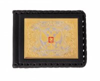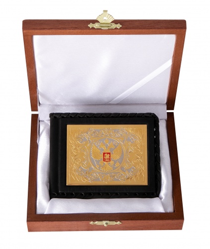 Обложка для удостоверения герб рф. Материал: латунь, натуральная кожа. Покрытие: золотом 999,9; никелем. Техника исполнения: токарные и слесарные работы, рисовка кистью на металле, многоступенчатая гравировка иглой по лаку, травление, ручная подрезка, полировка. Обложка для удостоверений надолго сохранит ваши документы. Имея размеры всего 85х107 мм и проработанную форму, она не займет много места и с легкостью поместится в кармане ваших брюк, пиджака или рубашки. Обложка выполнена из натуральной телячьей кожи. Дорогой внешний вид и индивидуальность изделию придает оплетка кожаной нитью по краю аксессуара. Размеры: высота - 85 мм. ширина - 107 мм. Покрытие Гальванический метод