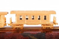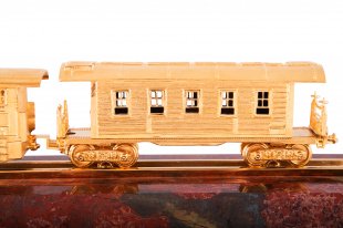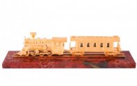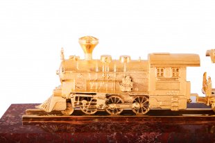 Сувенир железнодорожный состав. Материал: яшма, латунь. Покрытия: золотом 999,9; никелем. Техника исполнения: токарные и слесарные работы, художественное литье, полировка. Размеры: высота 90 мм. длина 400 мм. глубина 90 мм. Покрытие Гальванический метод