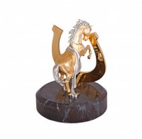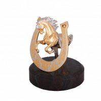Сувенир подкова с конем на счастье яшма. Материал: латунь, яшма, фианит. Покрытие: золотом 999,9; никелем. Техника исполнения: токарные и слесарные работы, рисовка кистью на металле, многоступенчатая гравировка иглой по лаку, травление, ручная подрезка, полировка. Размеры: Высота - 160 мм. Ширина - 130 мм. Покрытие Гальванический метод Вес брутто, кг 2.7