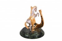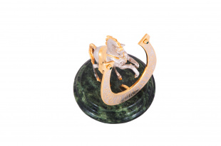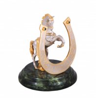 Сувенир подкова с конем на счастьезмеевик. Материал: латунь, змеевик, фианит. Покрытие: золотом 999,9; никелем. Техника исполнения: токарные и слесарные работы, рисовка кистью на металле, многоступенчатая гравировка иглой по лаку, травление, ручная подрезка, полировка. Размеры: Высота - 160 мм. Ширина - 130 мм. Покрытие Гальванический метод Вес брутто, кг 2.6