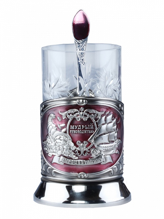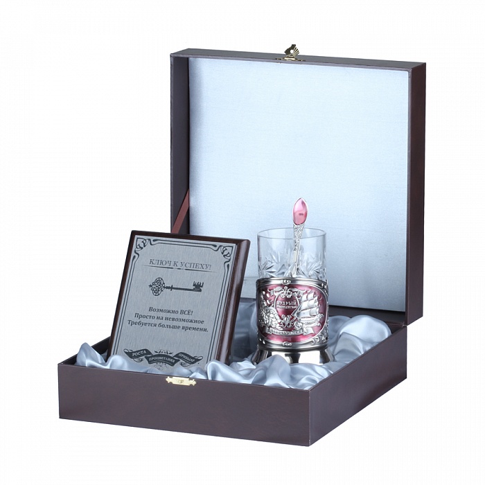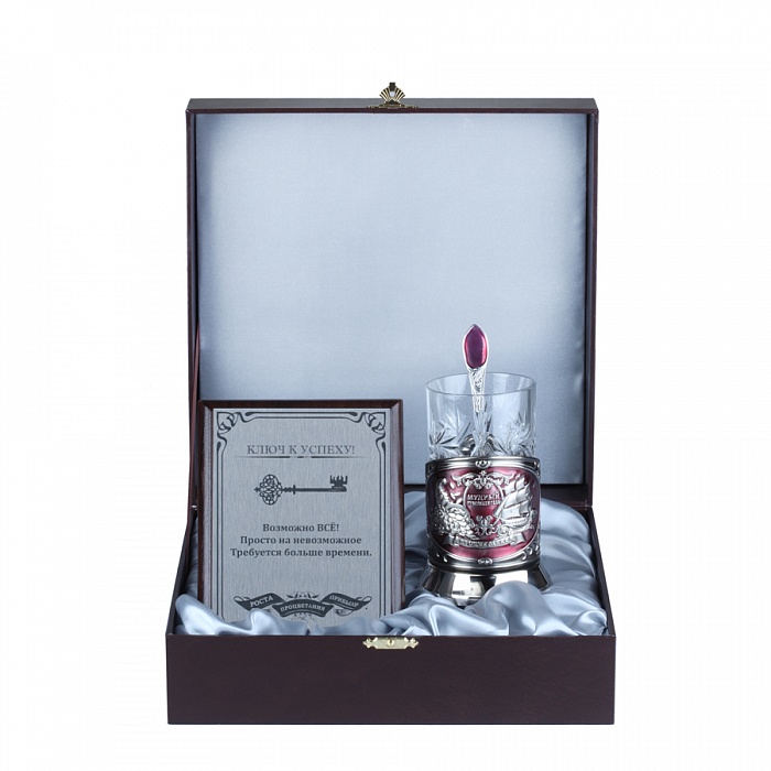 Детали: В подарочном футляре: подстаканник нивелированный ,плакетка с лазерной гравировкой,ложка Никелированный подстаканник с эмалью, хрустальный стакан,МДФ, металлическая