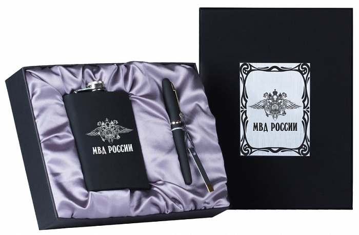 Набор подарочный герб мвд. Код товара: 10051673 Цвет: Черный Основной материал: Нержавеющая сталь/СофтТач Размер: Объем фляжки 240 мл, Детали: Шариковая ручка