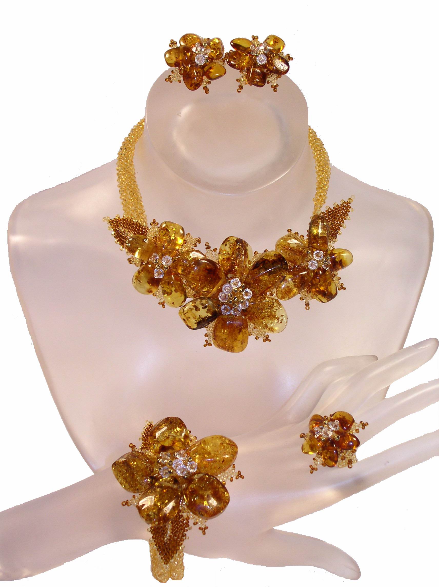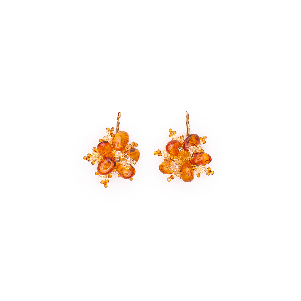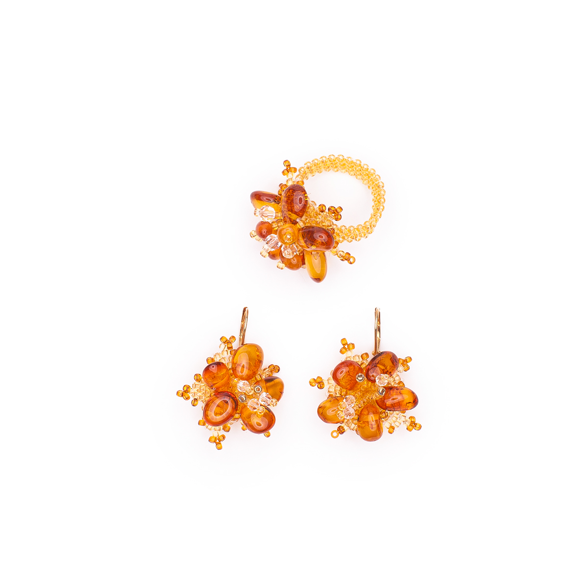 Комплект из натурального янтаря и бисера: серьги, кольцо
