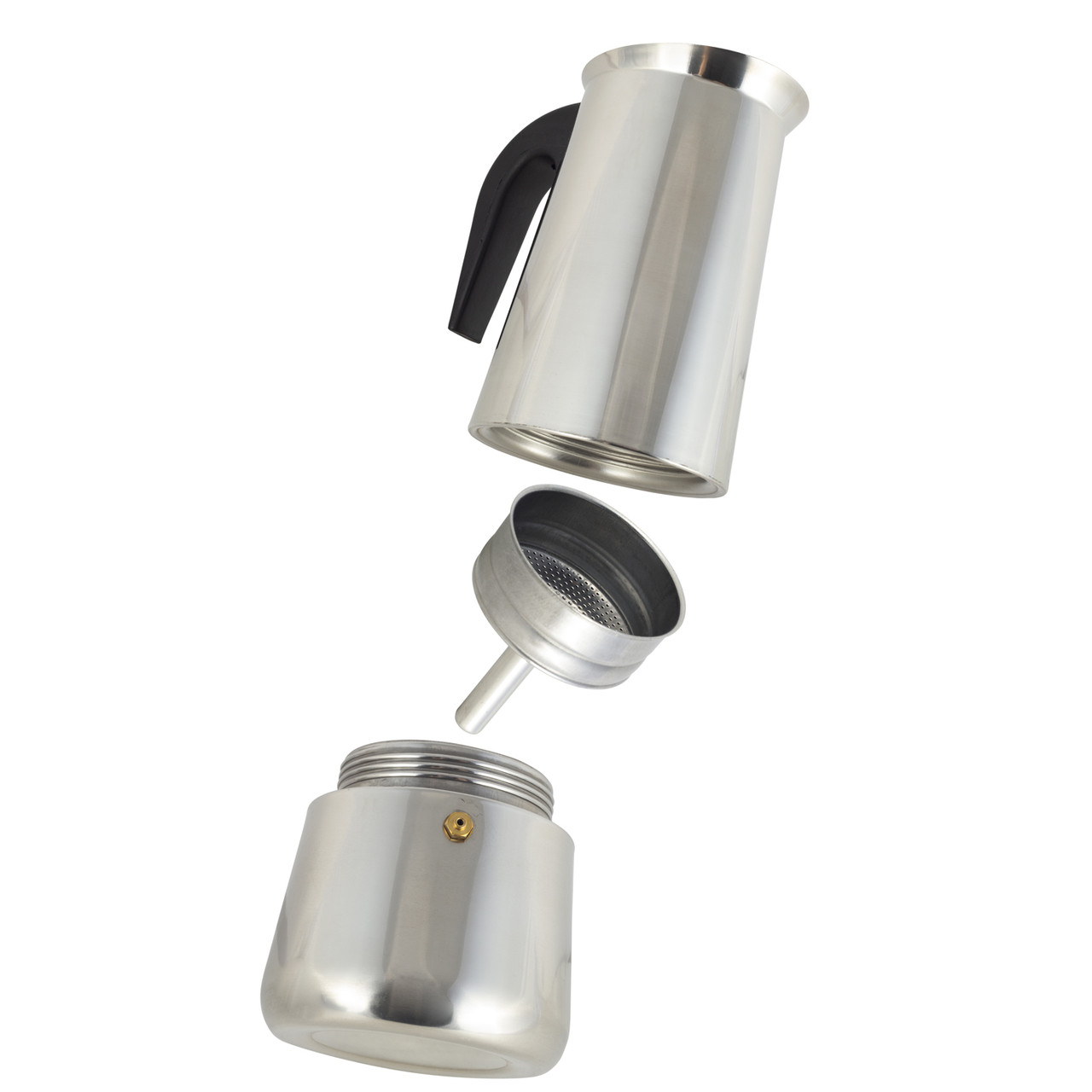 Кофеварка гейзерная 450 мл (9 порций) из нержавеющей стали ofenbach nb-101. Описание: Гейзерная кофеварка Ofenbach создана для приготовления великолепного кофе по современным итальянским технологиям. Используя ее на любых кухонных плитах (за исключением индукционных), за считанные минуты Вы сможете насладиться чашкой ароматного, хорошо проваренного кофе. Материал: нержавеющая сталь Полировка металла: зеркальная Материал ручки: бакелит Высота: 22,5 см Диаметр дна: 10,5 см Объем: 450 мл Количество порций: 9 Комплектация: нижняя емкость для воды емкость-фильтр для кофе фильтр силиконовое кольцо верхняя емкость Использование: Наполните нижнюю емкость водой, поместите сверху емкость-фильтр и наполните ее молотым кофе, не утрамбовывая его. Оденьте верхнюю секцию и прокрутите для закрытия. Убедитесь, что фильтр и силиконовое кольцо на месте и плотно прилегают друг к другу. Обратите внимание, что очень важно обеспечить таким образом полную герметичность. При приготовлении кофе уровень нагревания должен быть низким! Когда кофе перестанет поступать в верхнюю емкость, кофеварку необходимо убрать с нагревающей поверхности. Ароматный горячий кофе готов. Уход: После остывания кофеварки рекомендуется сразу раскрутить и вымыть ее при помощи небольшого количества моющего средства. Производить сборку только в сухом виде!