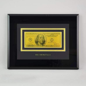 Настенное панно с банкнотой 100$. Материал:сусальное золото, дерево, стекло Страна:КИТАЙ Производство: Hsin Bi Golden