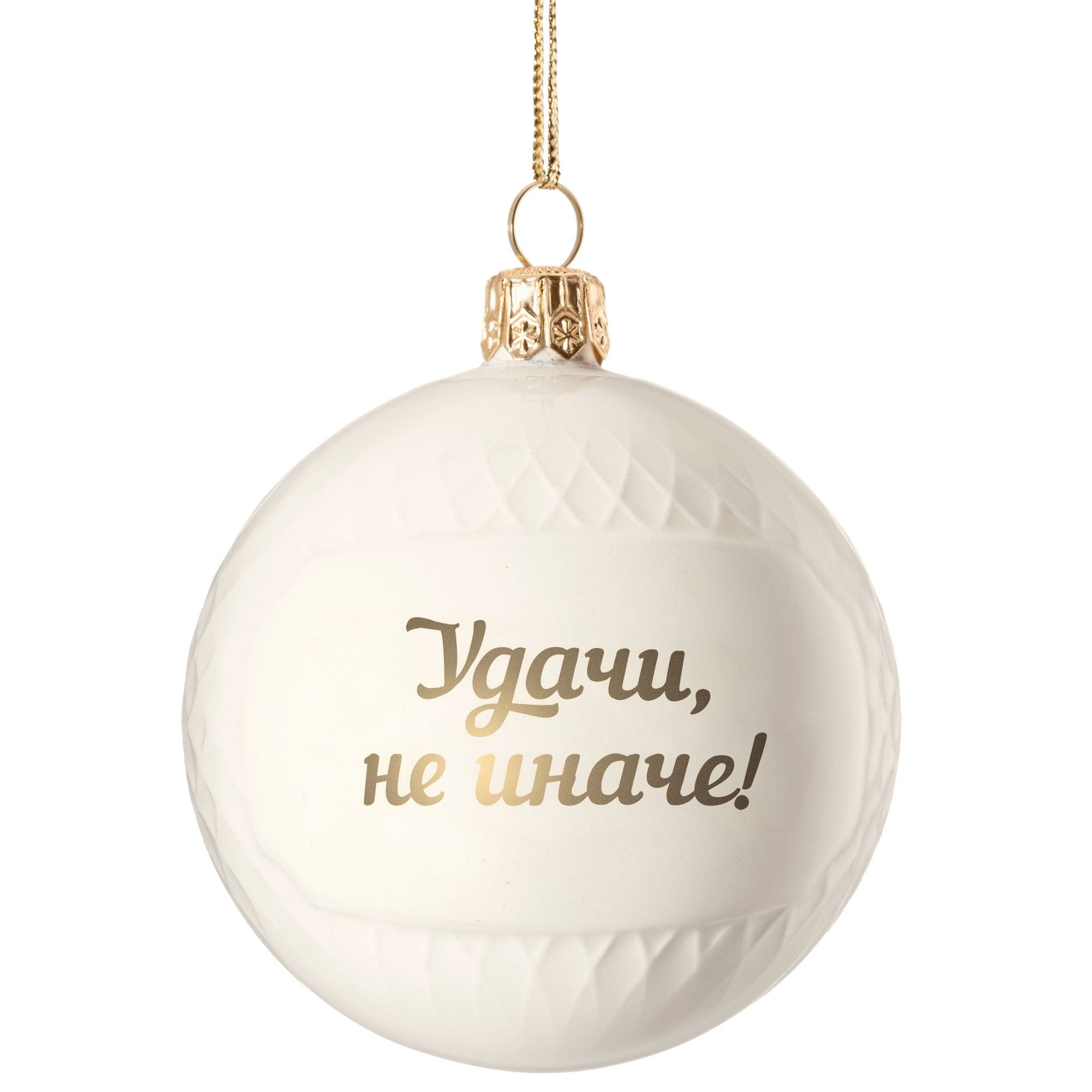 Елочный шар «всем новый год», с надписью «удачи, не иначе!». Размеры диаметр 6,5 см; упаковка: 12x11x9,7 см Материал фарфор Виды нанесения SH-Шелкография (1 цвет) T1-Тиснение бесцветное T2-Тиснение фольгой (1 цвет) В Новый год — без банальностей и с пожеланиями, которые вдохновят и заставят улыбнуться. Фарфоровый молочный шар с рельефным узором и запоминающейся надписью дополнит коллекцию символичных елочных игрушек и сохранит память о его дарителе и самом волшебном празднике в году. Надпись на шаре выполнена деколью. Елочный шар поставляется в подарочной коробке из белого картона с тиснением надписи на крышке.