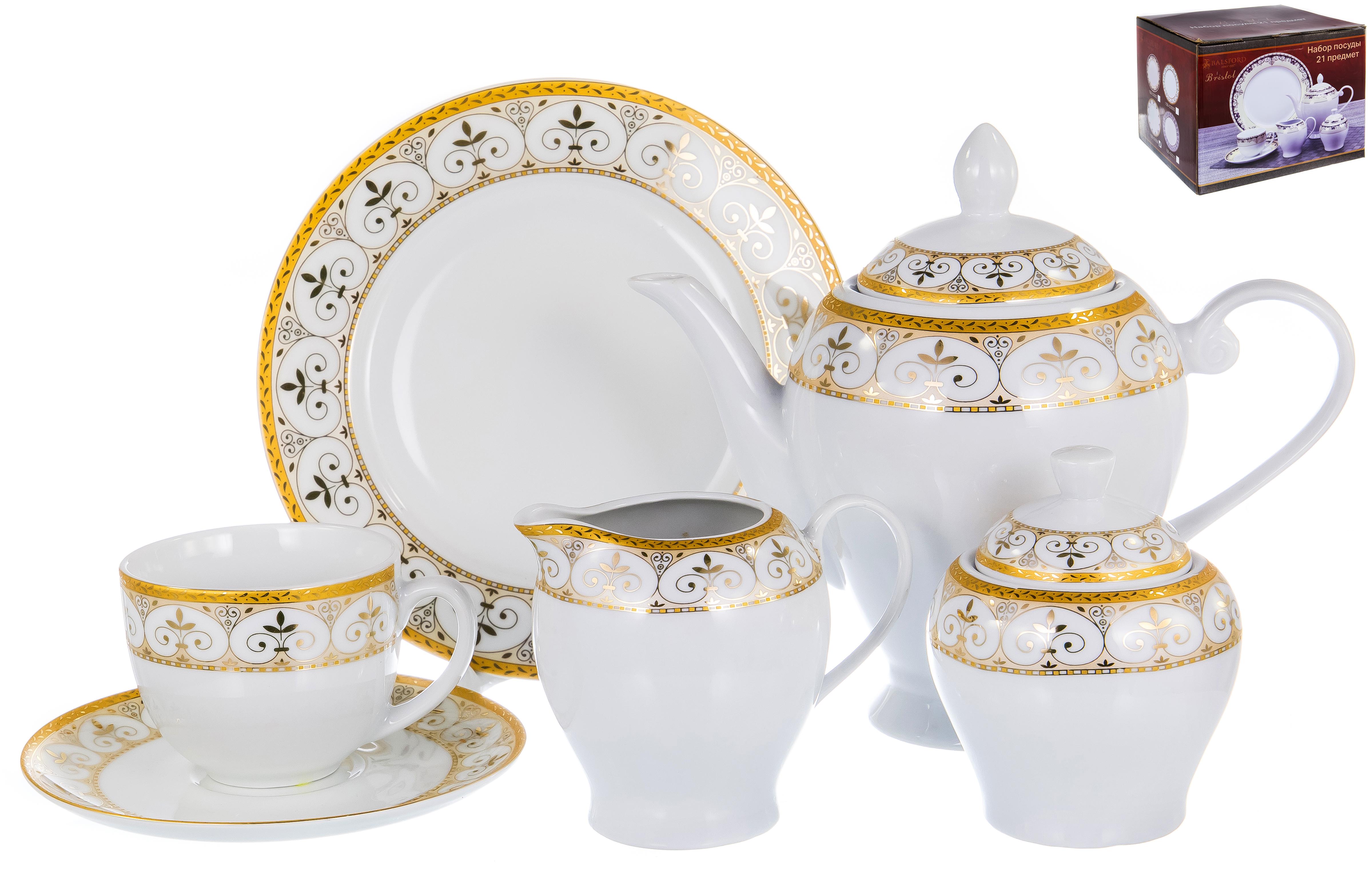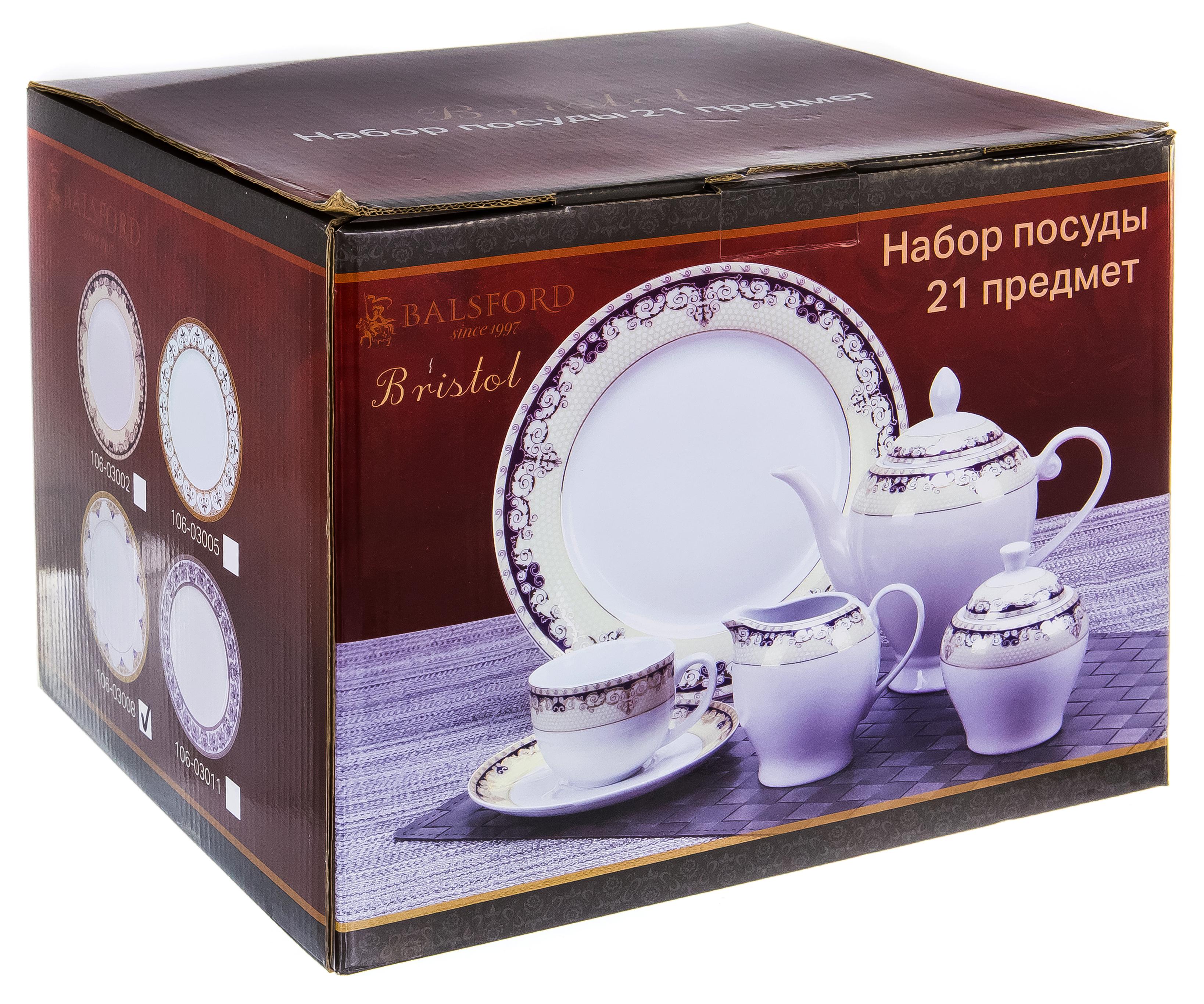 Набор посуды бристоль «джон», 21 предмет. Чашка 220мл 6 шт Блюдце 6 шт Чайник 1000мл 1 шт Сахарница 300мл 1 шт Молочник 300мл 1 шт Десертная тарелка 20см 6 шт Производитель Balsford Общие Материал Super white porcelain Линия Джон Штрих 4680411417619 Серия Бристоль Упаковка Тип упаковки подарочная упаковка Объём упаковки, м3 0,064 Подарочная упаковка да Внешний вид Форма круглая Информация о наборе Набор да В наборе, шт 21 Количество персон 6 Экспортная коробка Фасовка, уп 2 Вес коробки, кг 12,2 Бристоль, набор посуды (21) 6 чашек 220мл + 6 блюдец +чайник 1000мл+ сахарница 300мл + молочник 300мл+ 6 десертных тарелок 20см, superwhite porcelain, декор - золотой орнамент , подарочная упаковка
