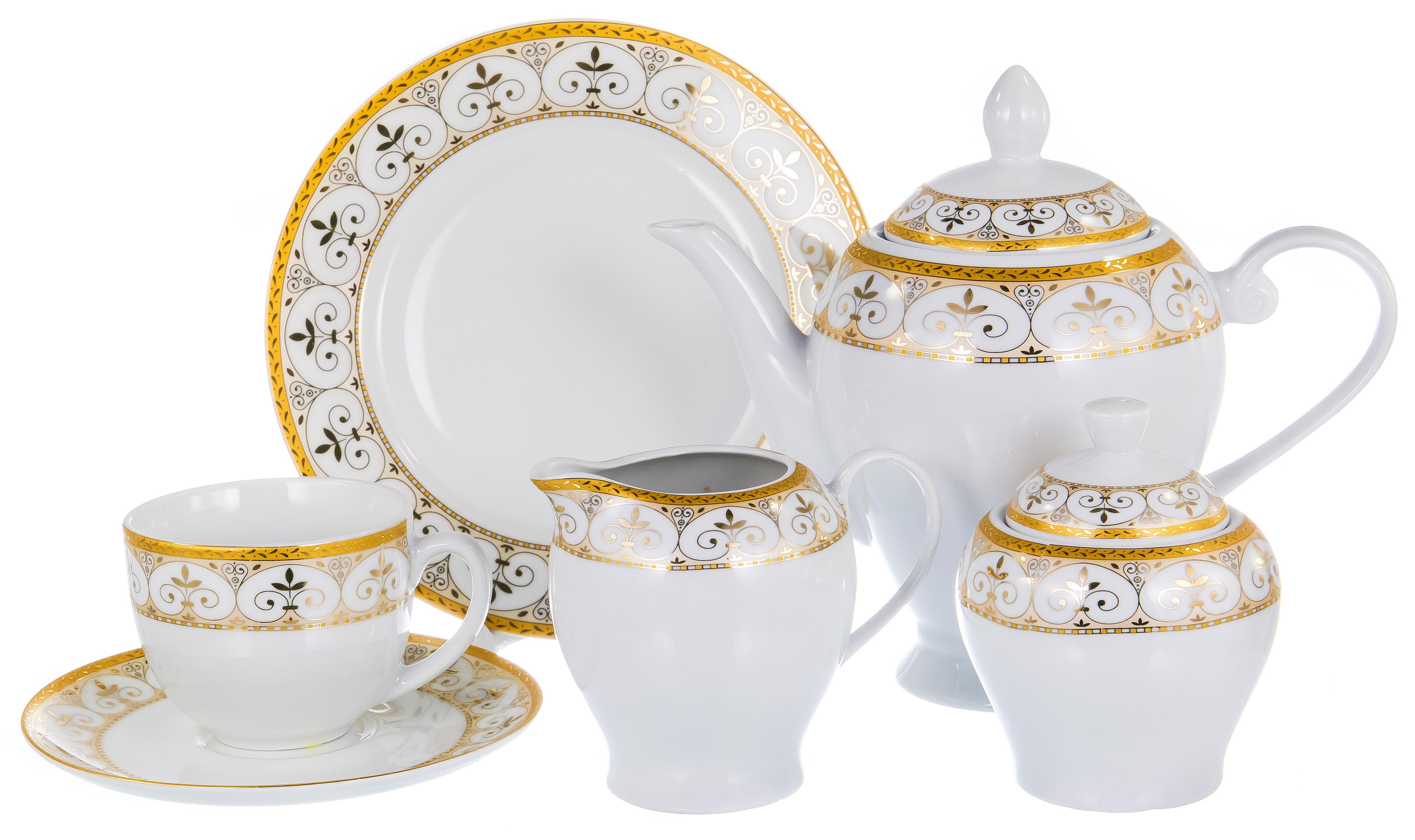 Чашка 220мл: 6 шт Блюдце 6 шт Чайник 1000мл 1 шт Сахарница 300мл 1 шт Молочник 300мл 1 шт Десертная тарелка 20см 6 шт