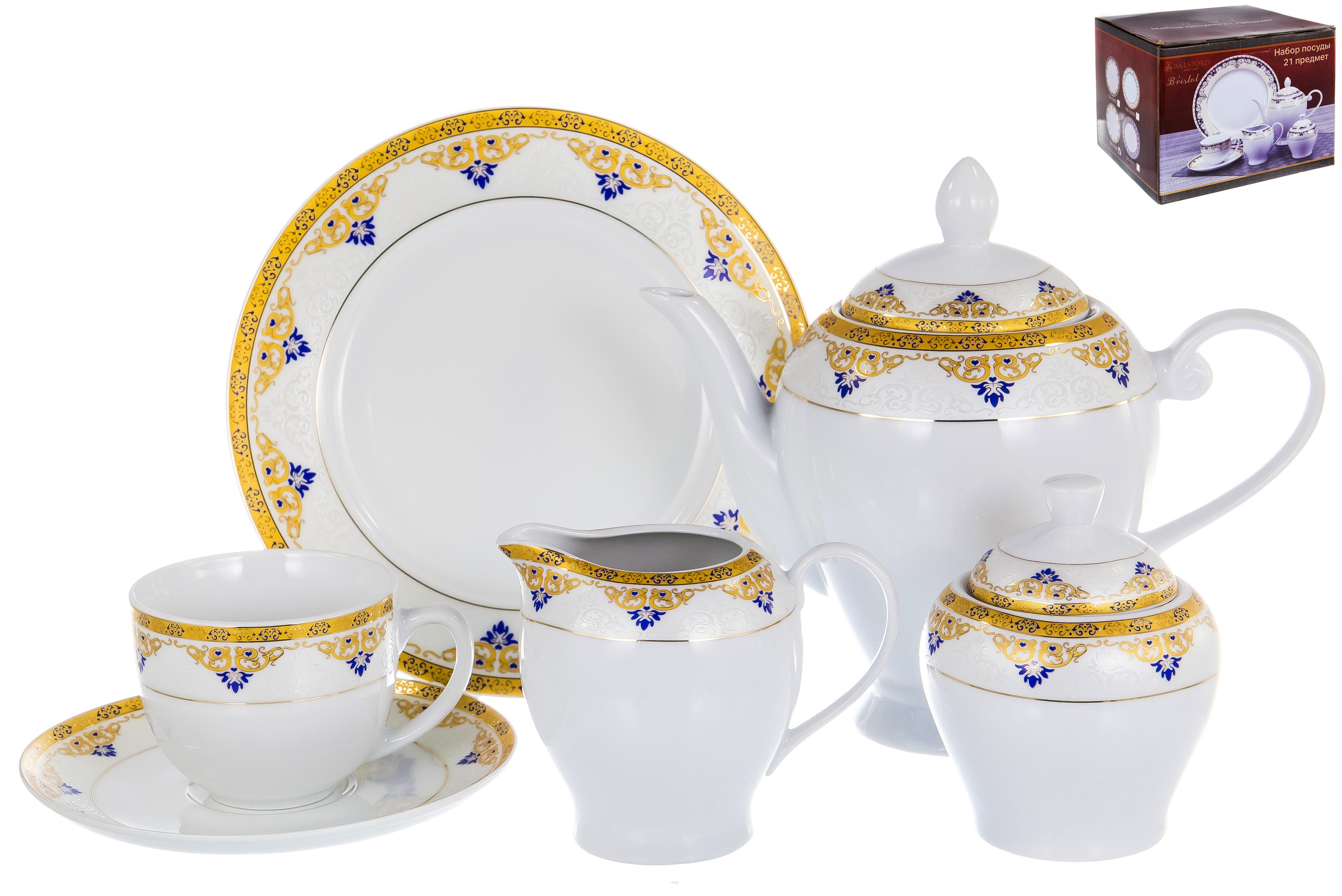 Набор посуды бристоль «уильям», 21 предмет. Чашка 220мл 6 шт Блюдце 6 шт Чайник 1000мл 1 шт Сахарница 300мл 1 шт Молочник 300мл 1 шт Десертная тарелка 20см 6 шт Производитель Balsford Общие Материал Super white porcelain Линия Уильям Штрих 4680411417589 Серия Бристоль Упаковка Тип упаковки подарочная упаковка Объём упаковки, м3 0,064 Подарочная упаковка да Внешний вид Форма круглая Информация о наборе Набор да В наборе, шт 21 Количество персон 6 Экспортная коробка Фасовка, уп 2 Вес коробки, кг 12,2 Бристоль, набор посуды (21) 6 чашек 220мл + 6 блюдец +чайник 1000мл+ сахарница 300мл + молочник 300мл+ 6 десертных тарелок 20см, superwhite porcelain, декор - золотой орнамент , подарочная упаковка