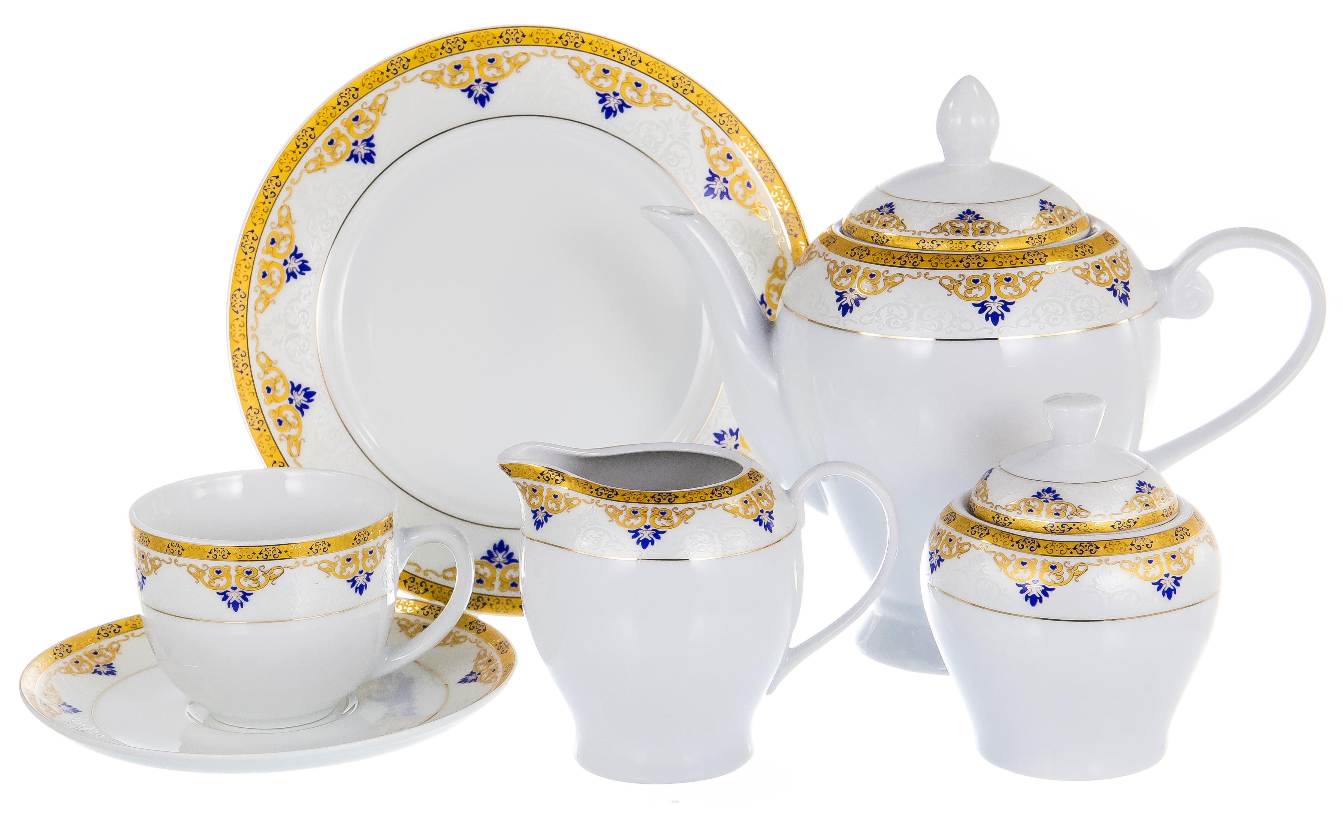 Чашка 220мл: 6 шт Блюдце 6 шт Чайник 1000мл 1 шт Сахарница 300мл 1 шт Молочник 300мл 1 шт Десертная тарелка 20см 6 шт