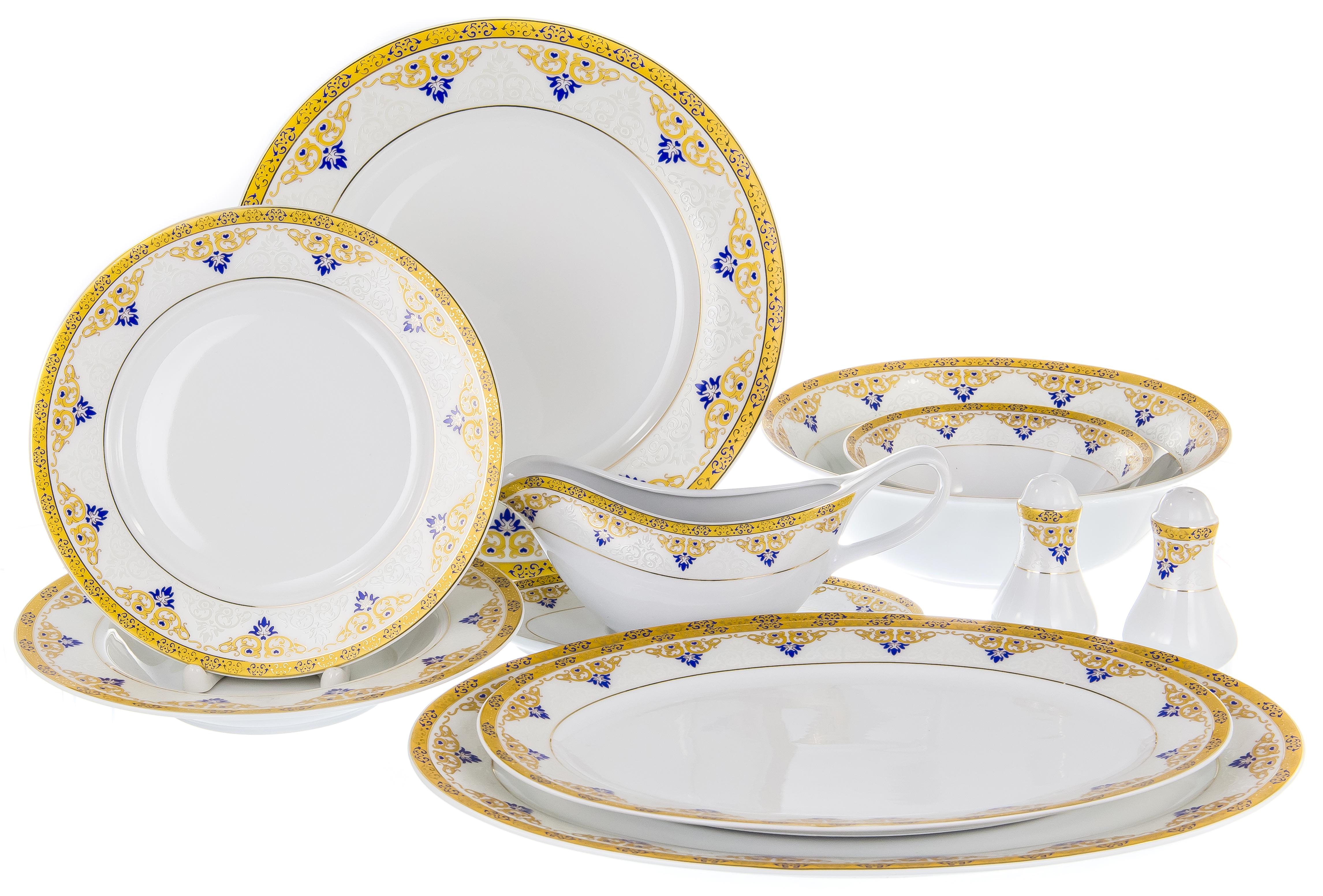 6 шт Глубокая тарелка 22см 6 шт Мелкая тарелка 21см 6 шт Салатник 450мл 2 шт Салатник 1400мл 1 шт Блюдо овальное 30см 1 шт Блюдо овальное 35см 1 шт Соусник 250мл с блюдом 20 см 1 шт Солонка 5х8,3см 1 шт Перечница 5х8,3см 1 шт