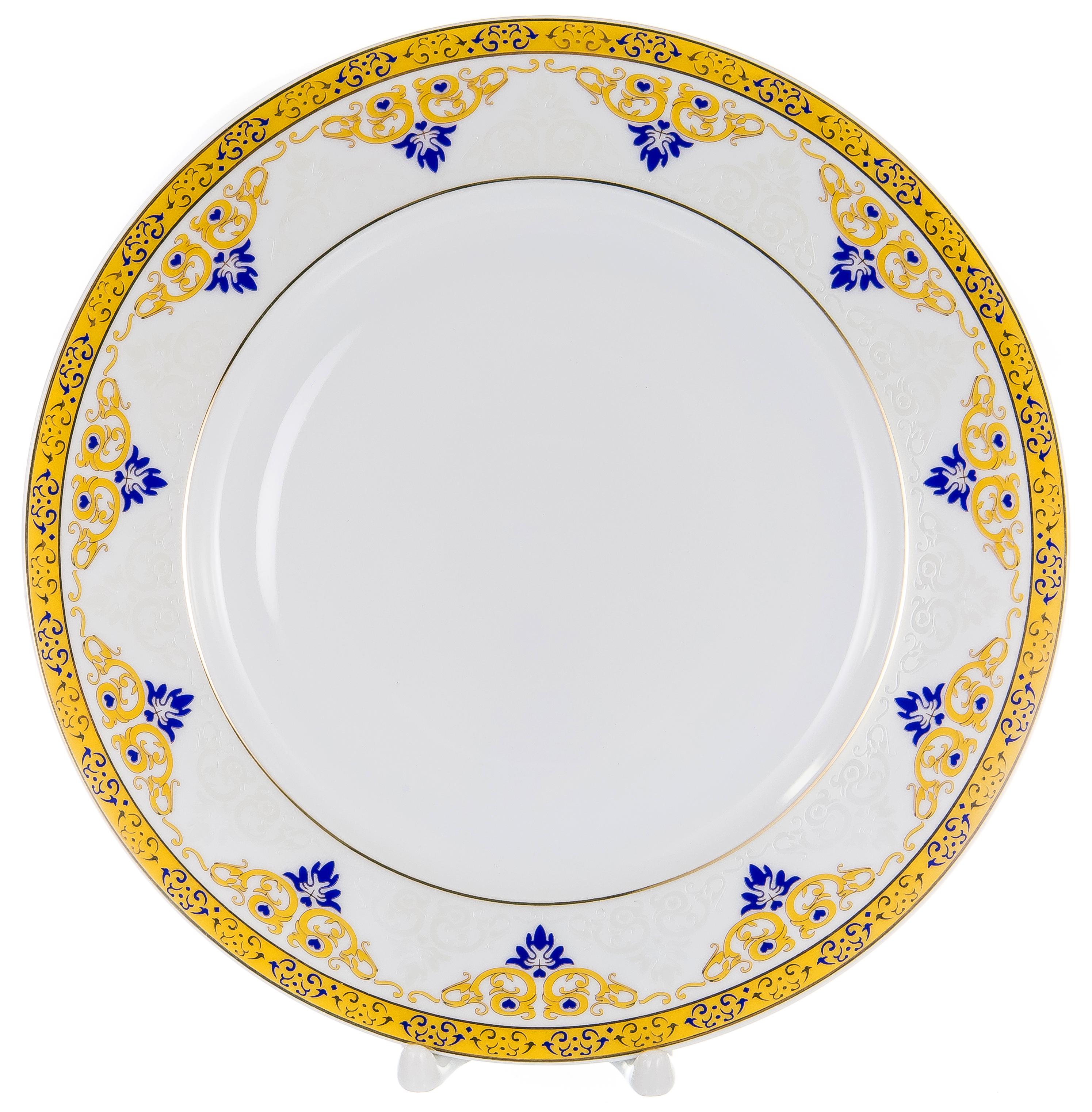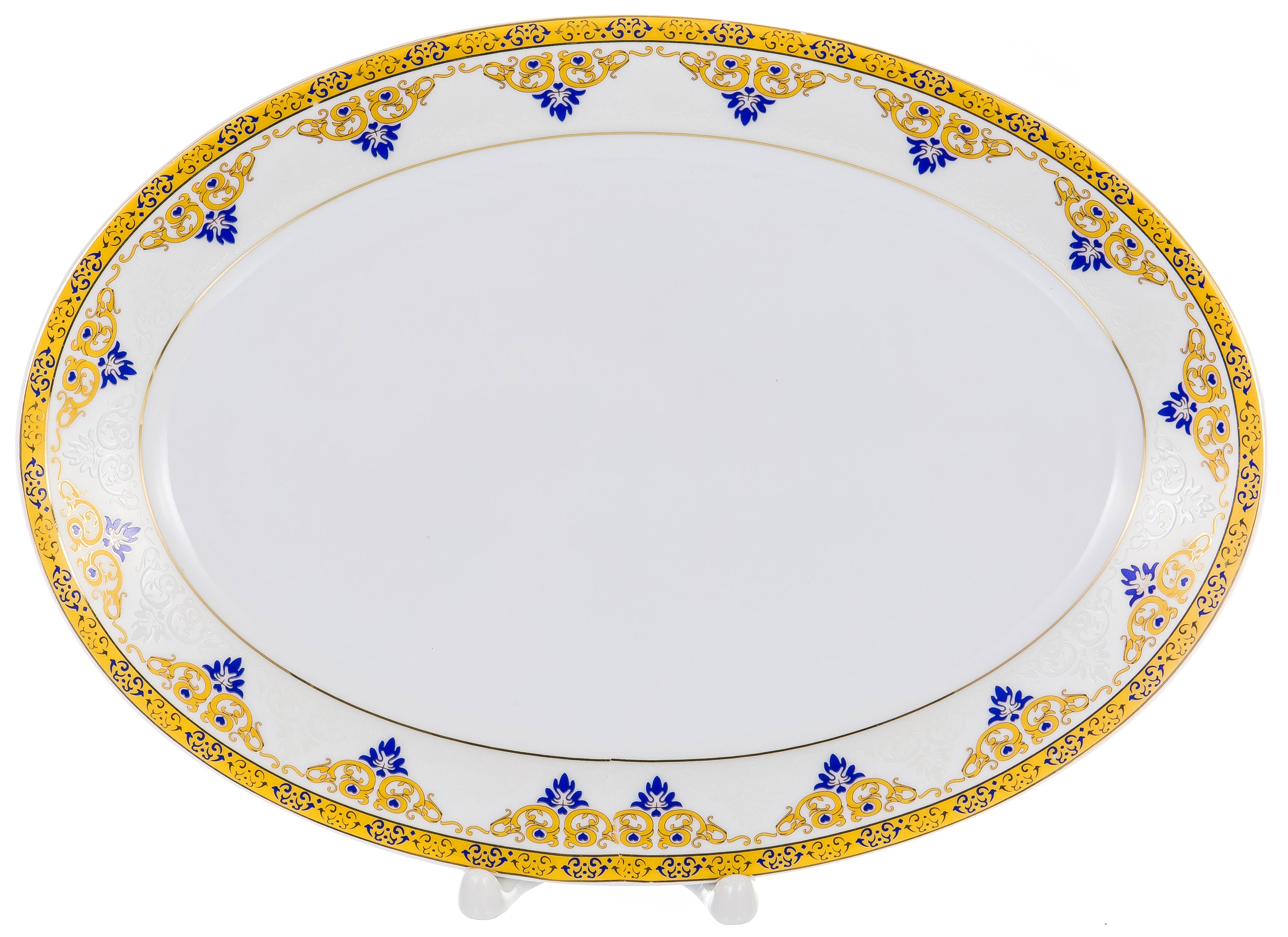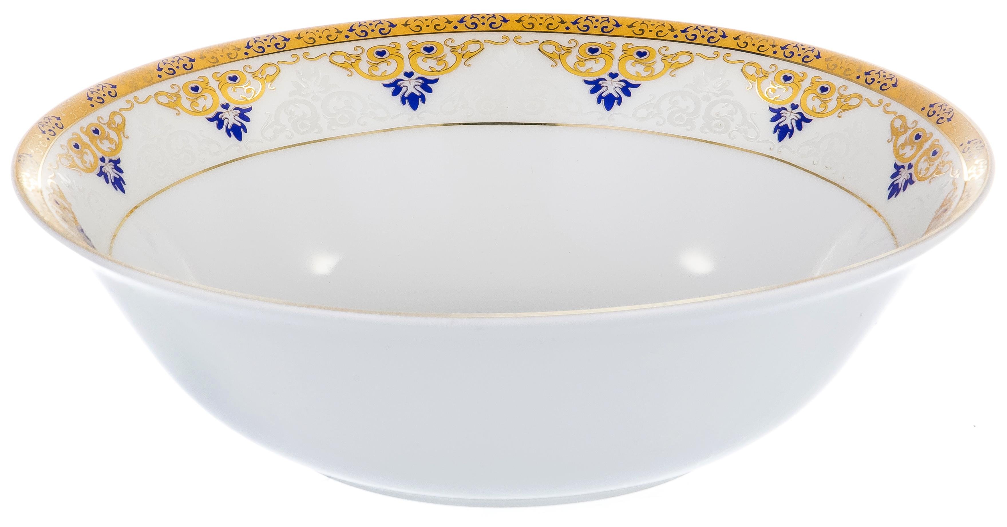 Бристоль, набор столовый (27) 6 подстановочных тарелок 26см + 6 глубоких тарелок 22см + 6 мелких тарелок 21см + 2 салатника 450мл + салатник 1400мл + блюдо овальное 30см + блюдо овальное 35см + соусник 250мл с блюдом 20 см + солонка + перечница, superwhite porcelain, декор - золотой орнамент , подарочная упаковка