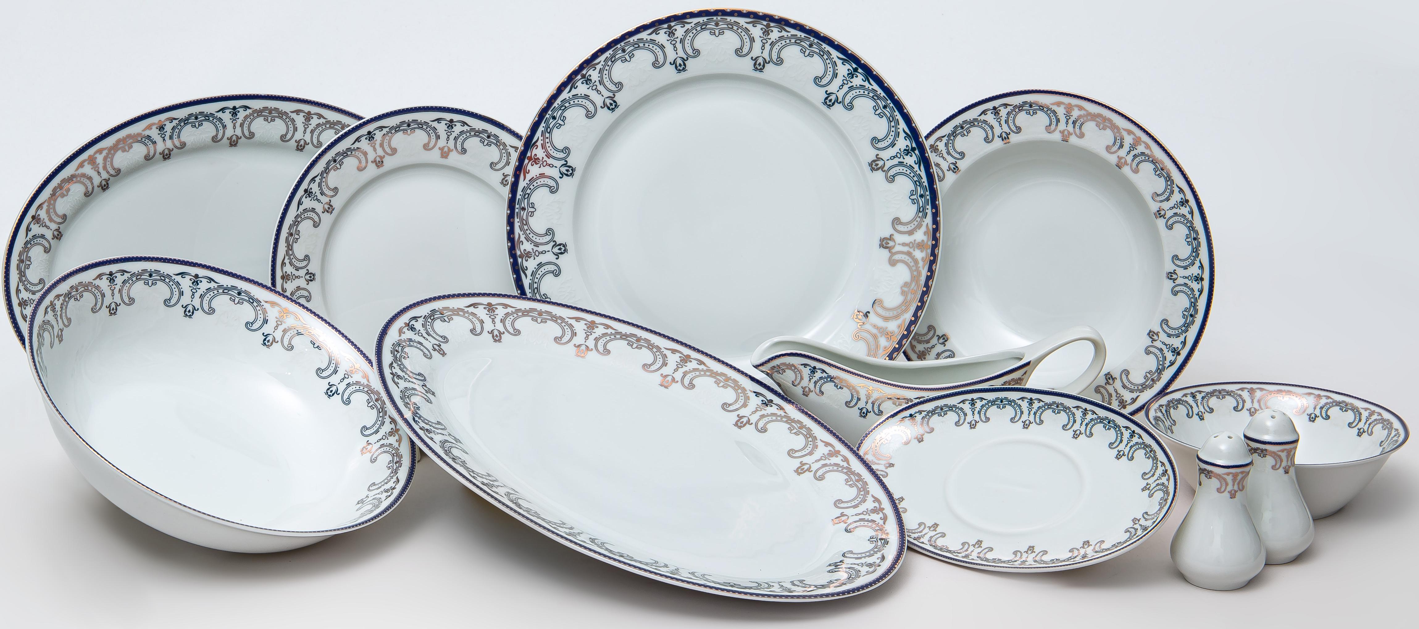 Мелких тарелок 270мм: 6 шт Глубоких тарелок 220мм 6 шт Мелких тарелок 210мм 6 шт Салатника 450мл 160мм, салатник 1400мл 230мм 2 шт Блюдо овальное 300мм 1 шт Блюдо овальное 360мм 1 шт Соусник 250мл с/подставкой 200мм 1 шт Солонка 80мм+ перечница 80мм 1 шт